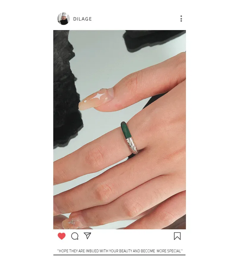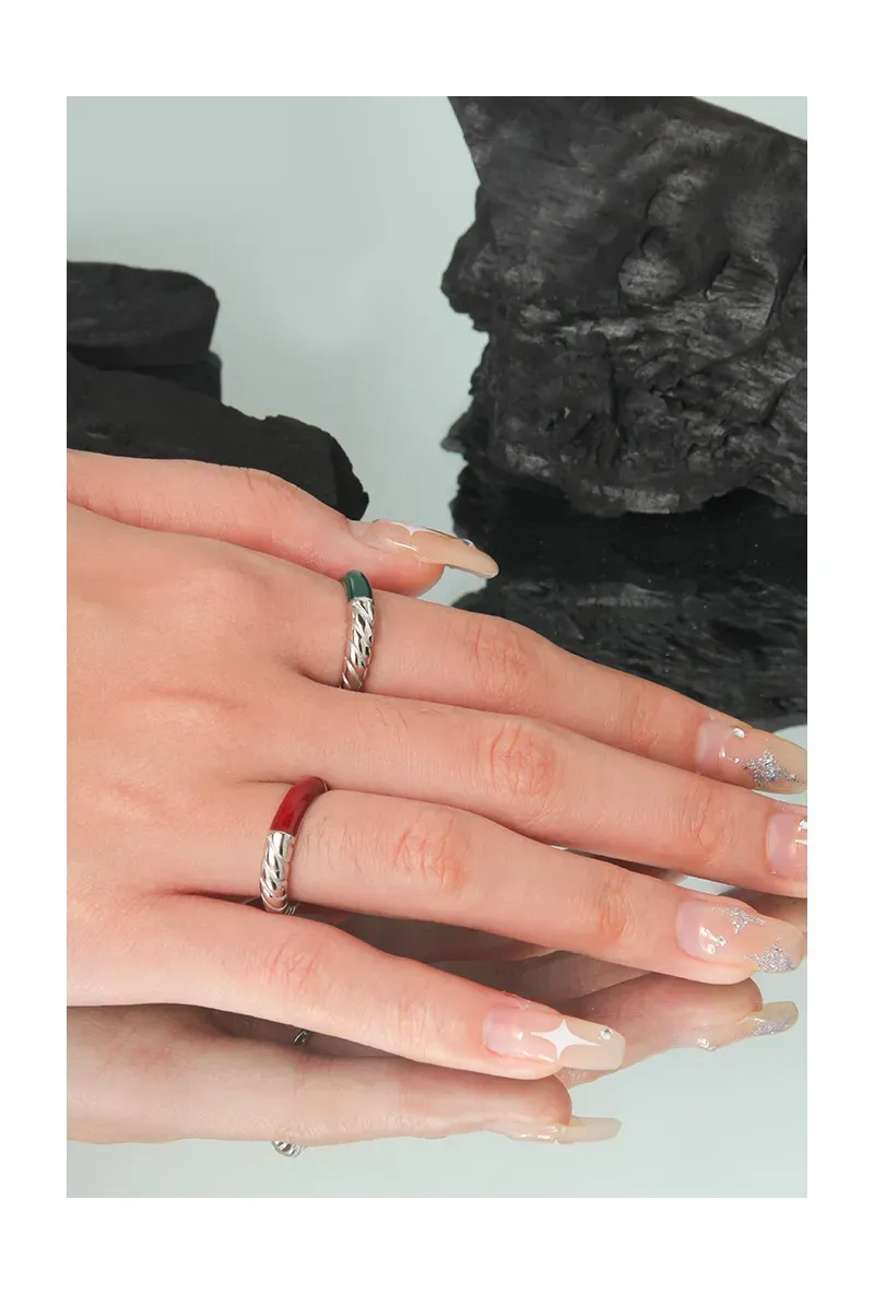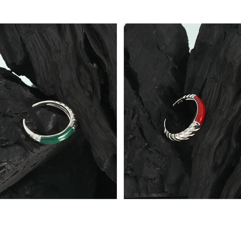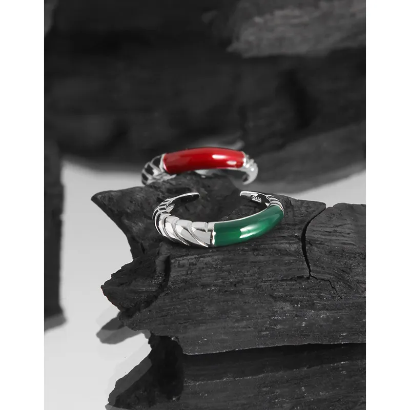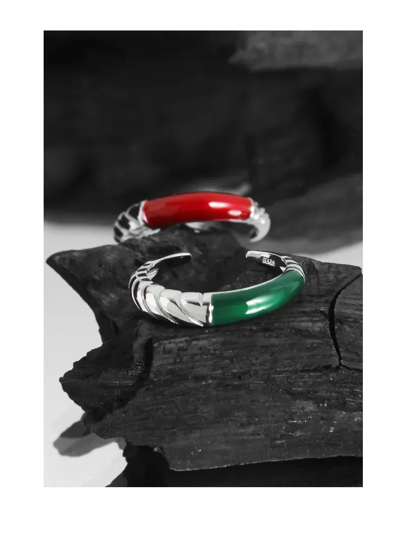 - Color: One half of each adjustable ring features a vibrant, smooth enamel segment: a rich, deep forest green on one, and a captivating, glossy burgundy red on the other. The radiant silver-tone metal beautifully complements these hues, evoking the depth of nature’s elements and a celestial shimmer.