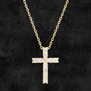 • Style: An elegant and classic cross pendant design, meticulously crafted from an array of round brilliant diamonds. This spiritual piece is suspended from a delicate, understated chain, offering a sophisticated and timeless look.