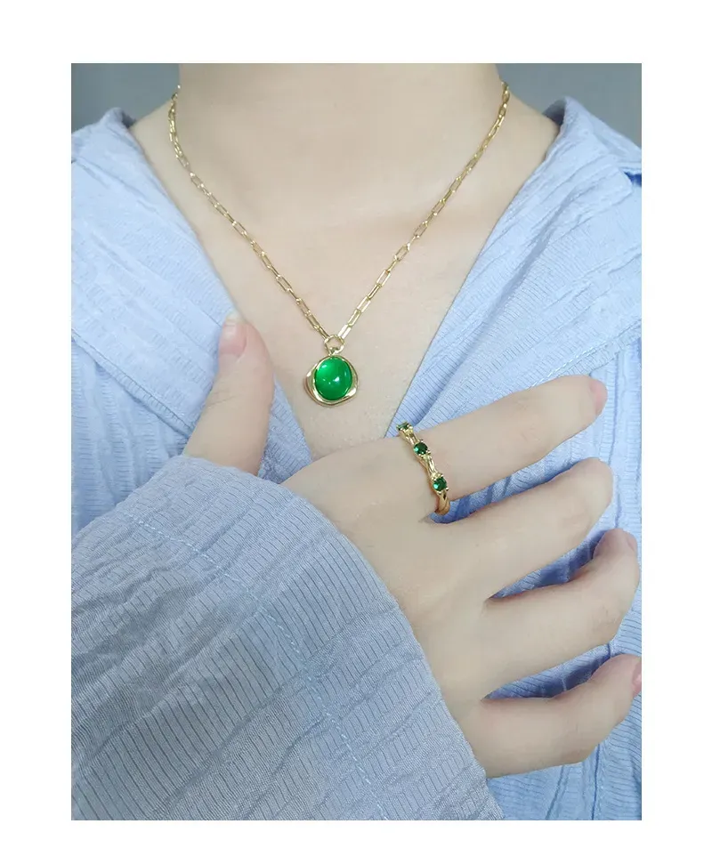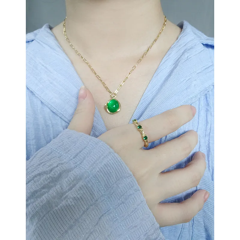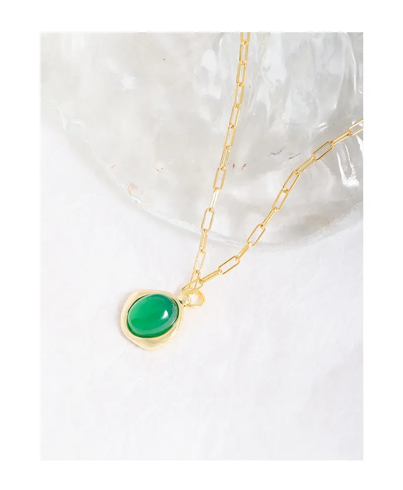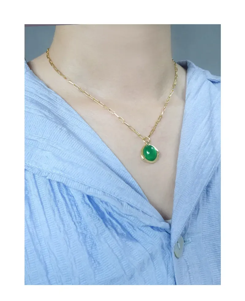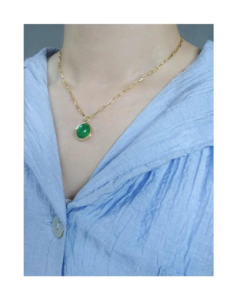 • Patterns or Textures: The chain comprises smooth, polished gold links that interlock in a sleek, elongated pattern, providing a refined backdrop. The pendant’s gold setting boasts a subtly undulating, raw-textured edge, creating a tactile contrast against the perfectly smooth, dome-shaped green gemstone. This balance highlights the interplay of “raw textures” and refined surfaces, telling a story of nature’s artistry.