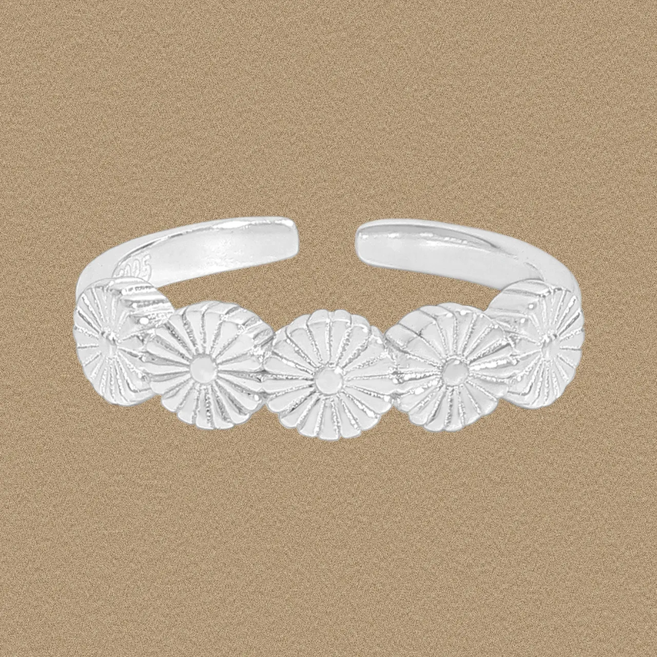• Patterns & Textures: Adorned with five distinct, finely detailed circular patterns. Each motif showcases radial lines, creating a textured chrysanthemum or sunburst effect that beautifully contrasts with the smooth, lustrous band. The “925” mark confirms its sterling silver composition.