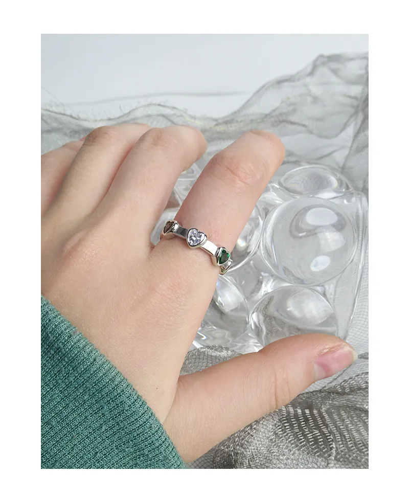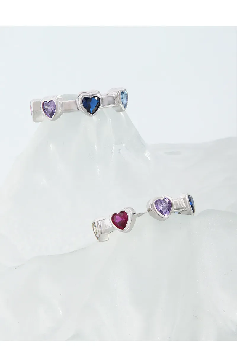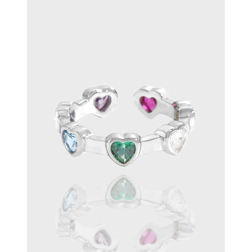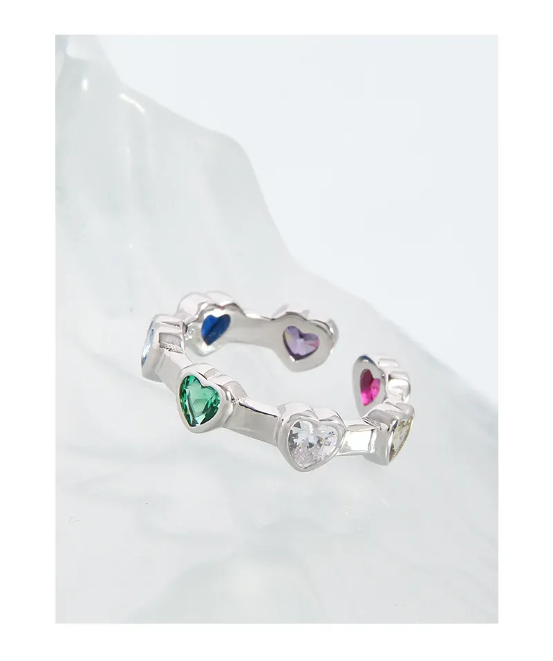 • Color: A brilliant display of multi-colored, faceted heart-shaped gemstones, including serene light blue, lush emerald green, sparkling clear, mystical purple, and vibrant fuchsia, all set within a sleek, polished silver-toned band.