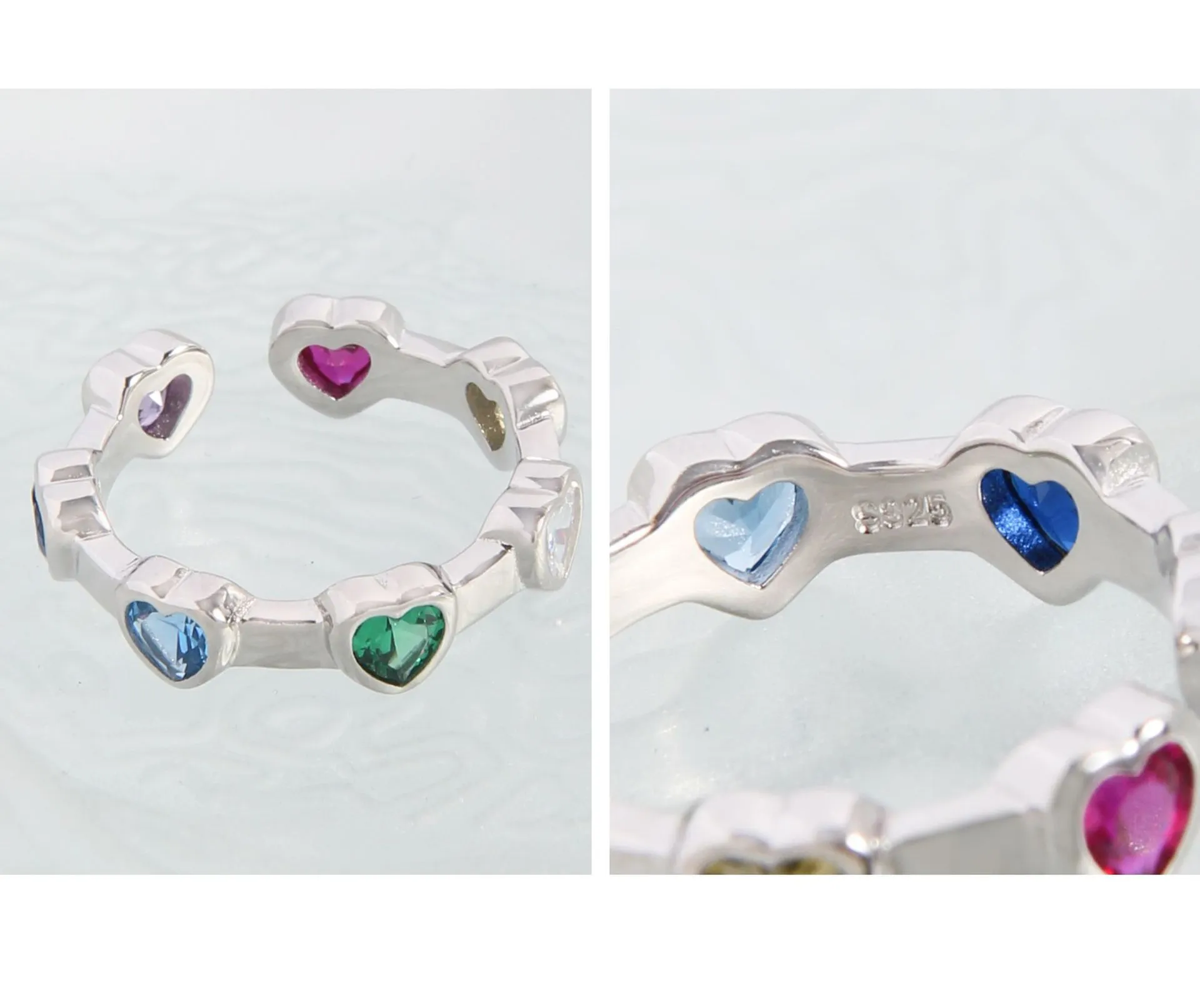 • Patterns & Textures: The smooth, reflective surface of the silver-toned band provides a striking contrast to the finely faceted heart gemstones, each cut to maximize its individual sparkle and depth. The continuous pattern of colorful hearts creates a fluid, organic flow, reminiscent of nature’s imperfect beauty and the ever-changing brilliance of light.