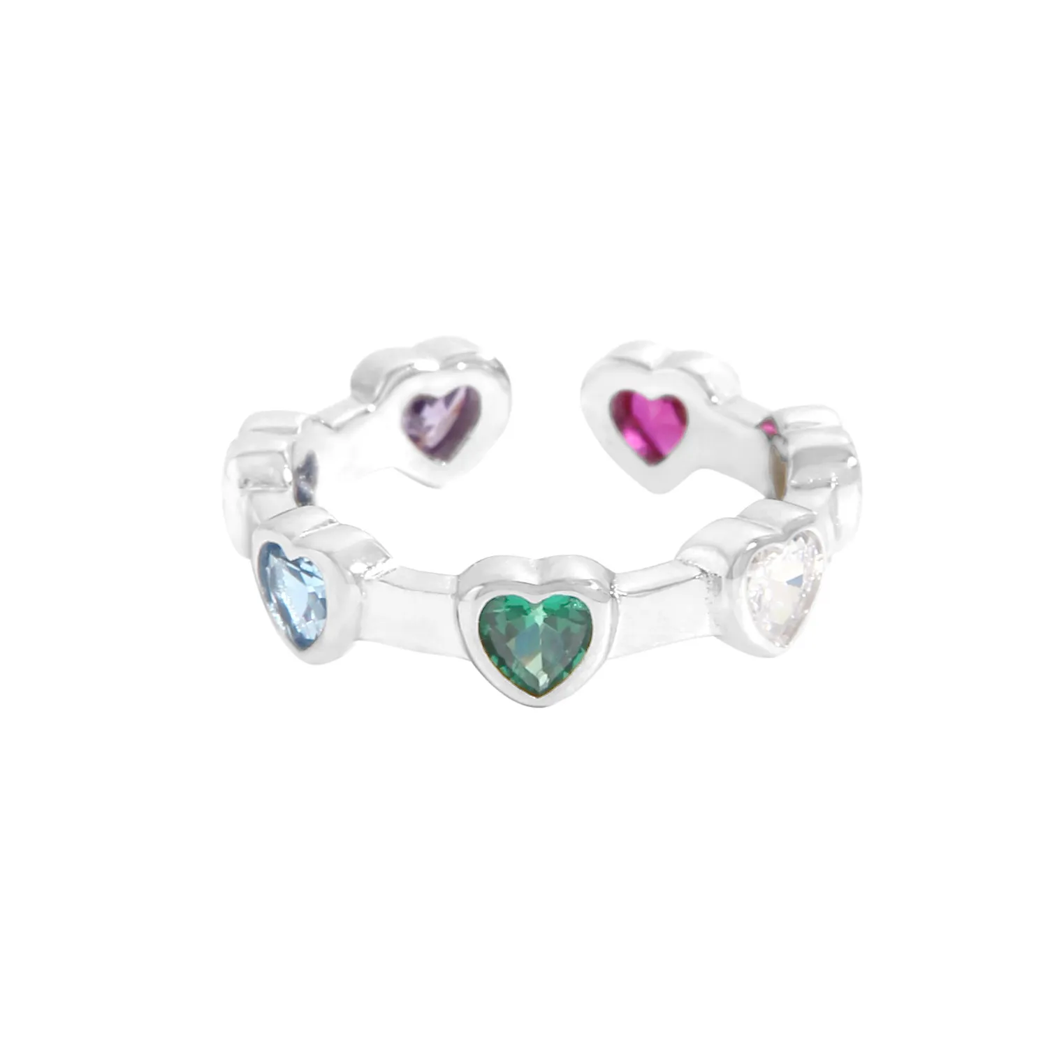 Embrace the enchanting magic of Malisse with this captivating open ring, a vibrant ode to nature’s artistry and celestial hues. This adjustable silver-toned band features a whimsical array of heart-shaped gemstones, each reflecting a unique facet of the cosmos.