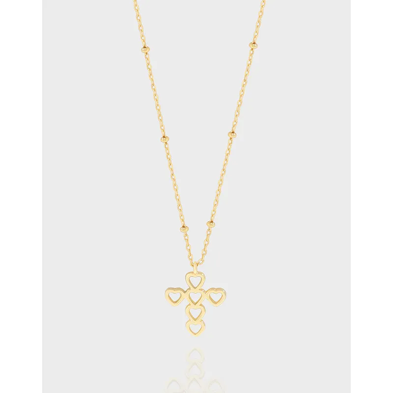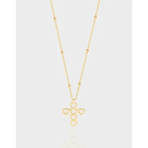 Style: This dainty and minimalist piece features a unique cross pendant artfully composed of five interconnected open hearts. Its sentimental design beautifully merges faith with affection, offering a fluid and organic take on a timeless symbol.