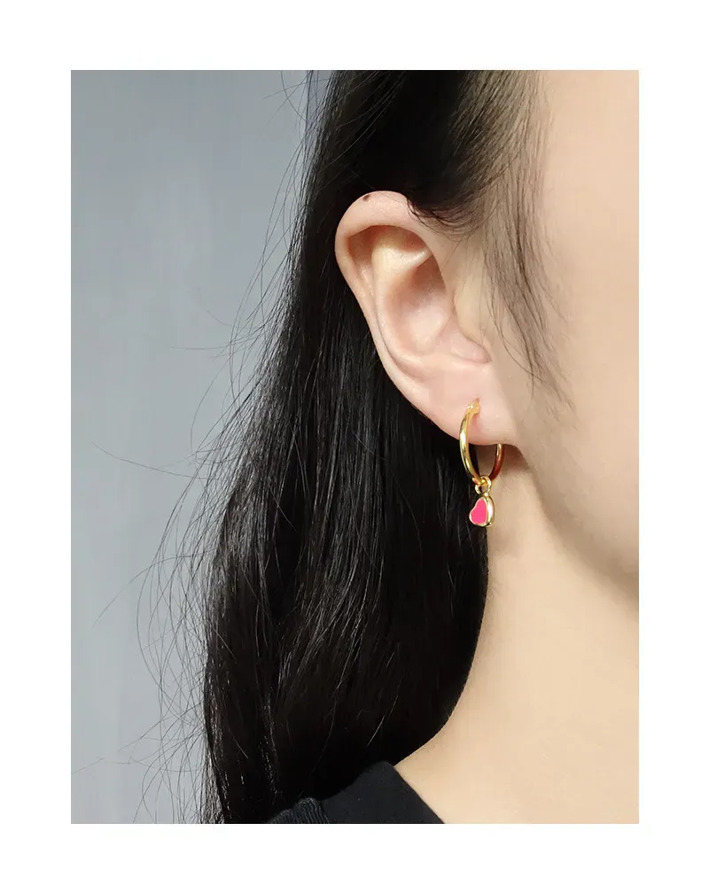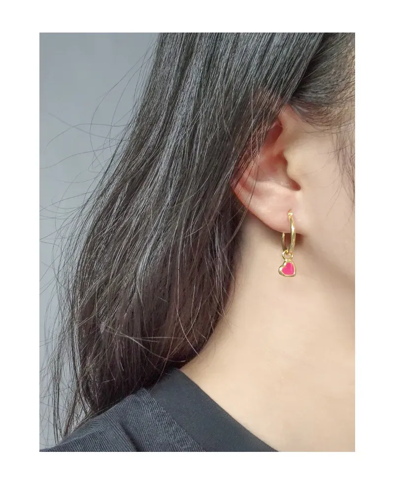 • Color: Crafted from radiant yellow gold, these hoops exude a warm, sun-kissed glow. Each heart charm features a captivating, vibrant pink enamel fill, a hue reminiscent of a breathtaking sunset or a delicate blossom in full bloom, echoing the celestial dance of colors Malisse embodies.