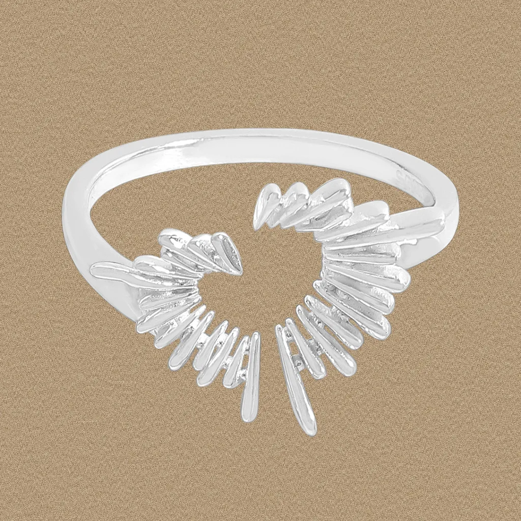 Each individual element boasts a distinct, raw texture, adding depth and an artisanal feel. The fluid shapes and uneven lengths of the spires capture the imperfect beauty found in natural patterns, making this ring a modern ode to the magic of the cosmos and the world around us.