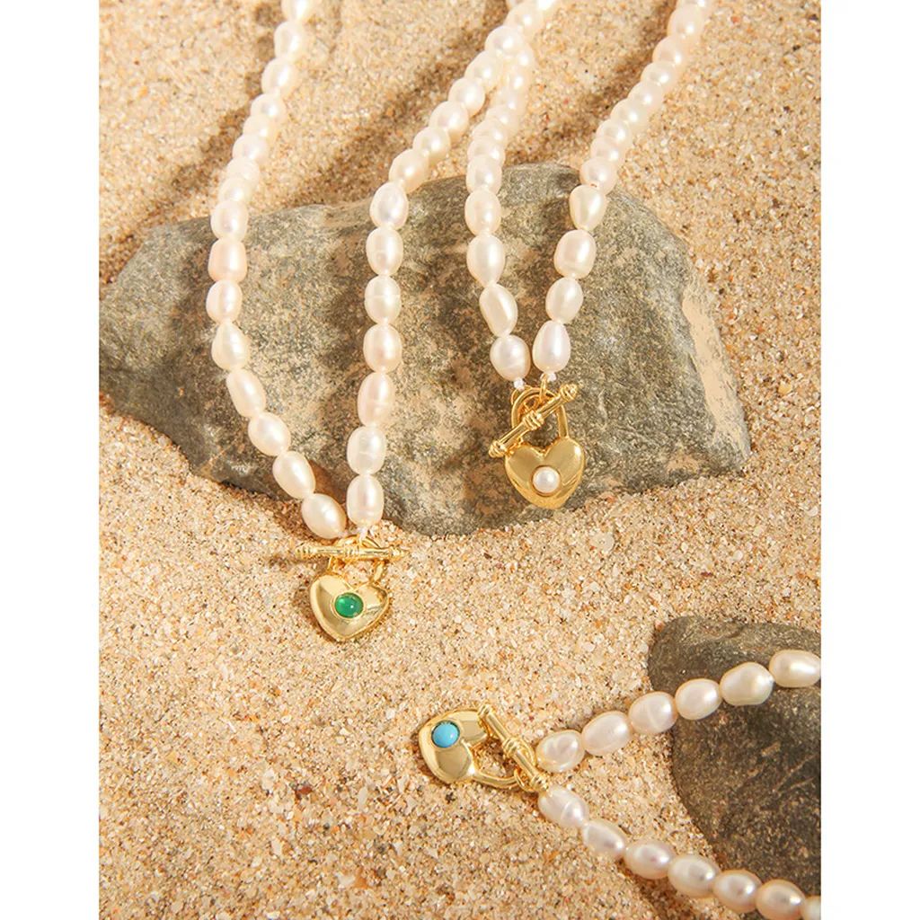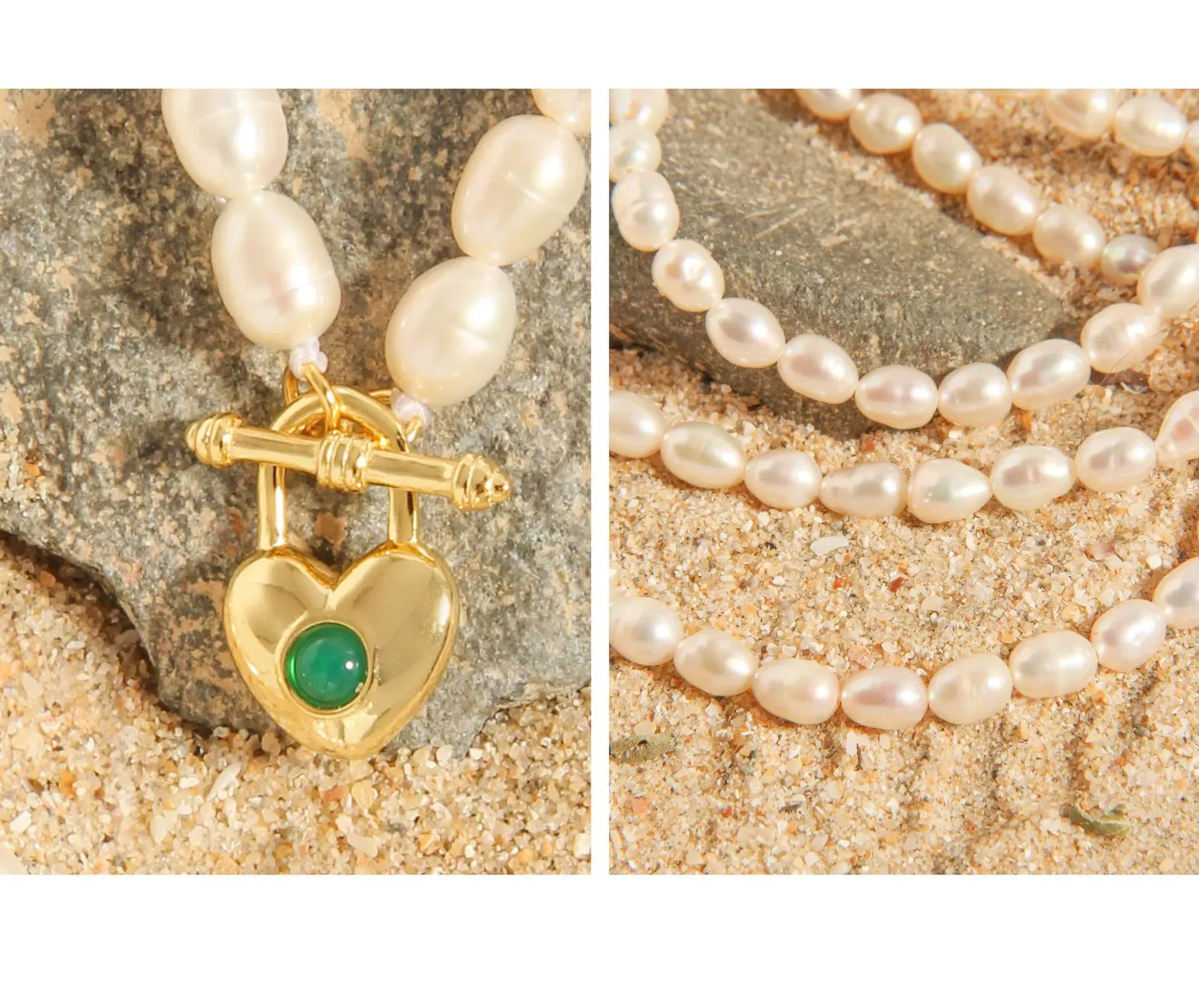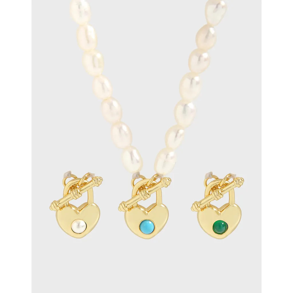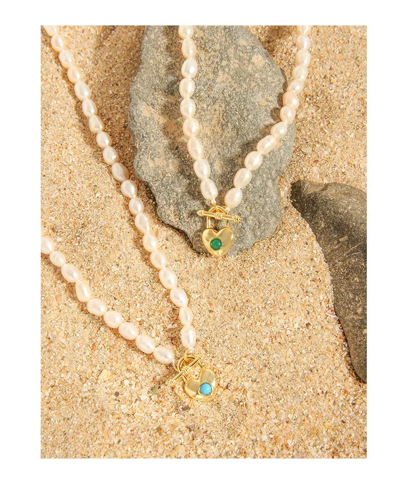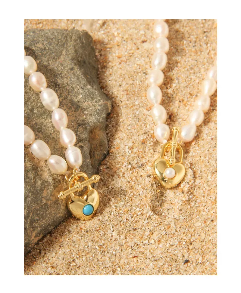 This captivating Celithra Necklace features lustrous, irregularly shaped freshwater pearls in a creamy white hue, forming the elegant chain. The centerpiece is a radiant gold-toned heart-shaped padlock pendant. For a touch of personalized charm, the pendant comes with interchangeable cabochon gemstones in vibrant turquoise, deep forest green, or a classic white pearl, allowing you to match your mood or attire.