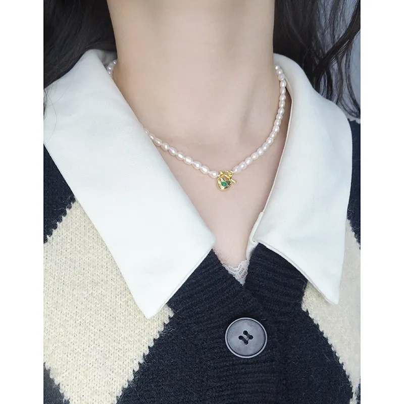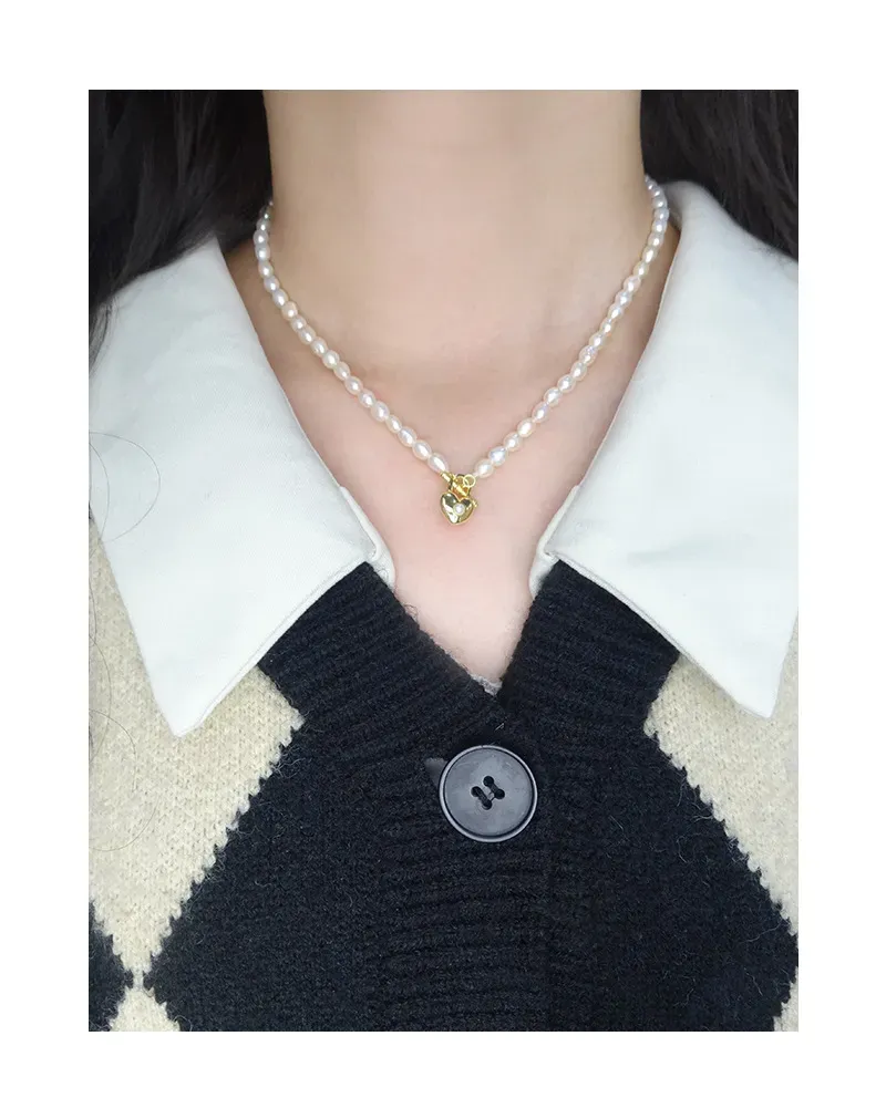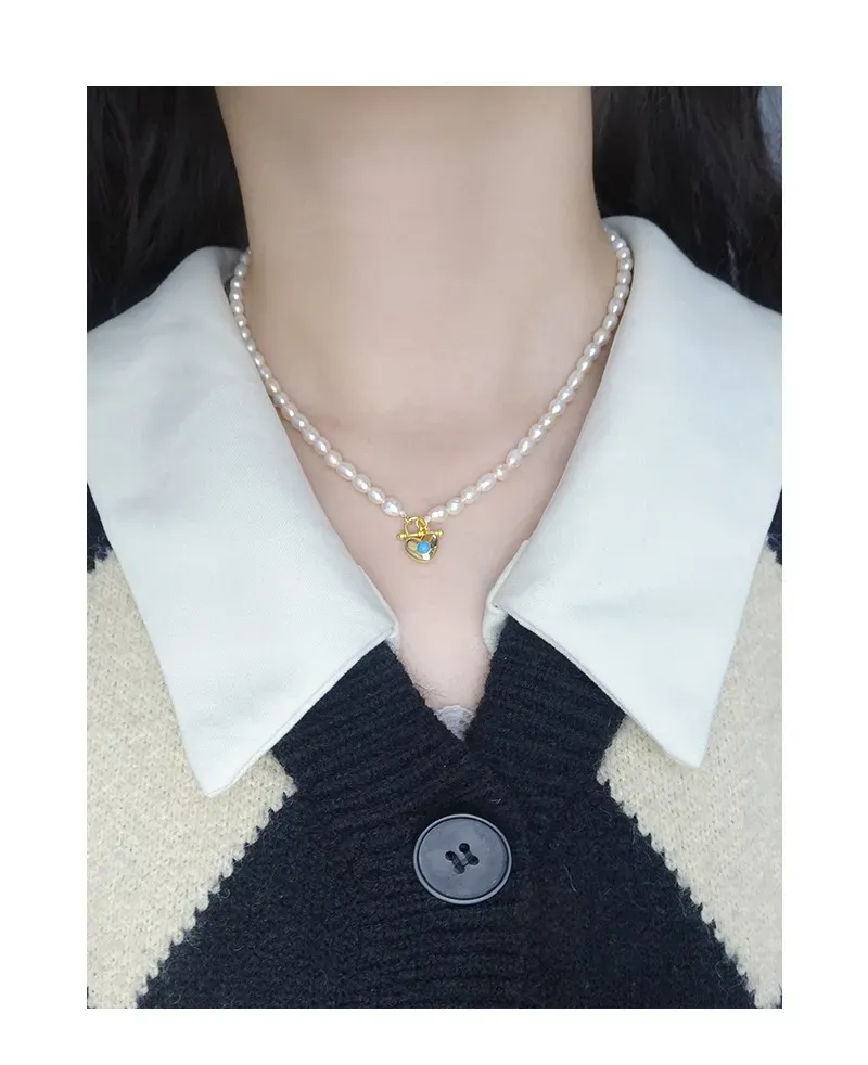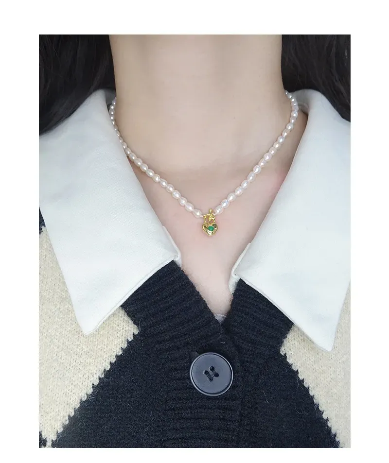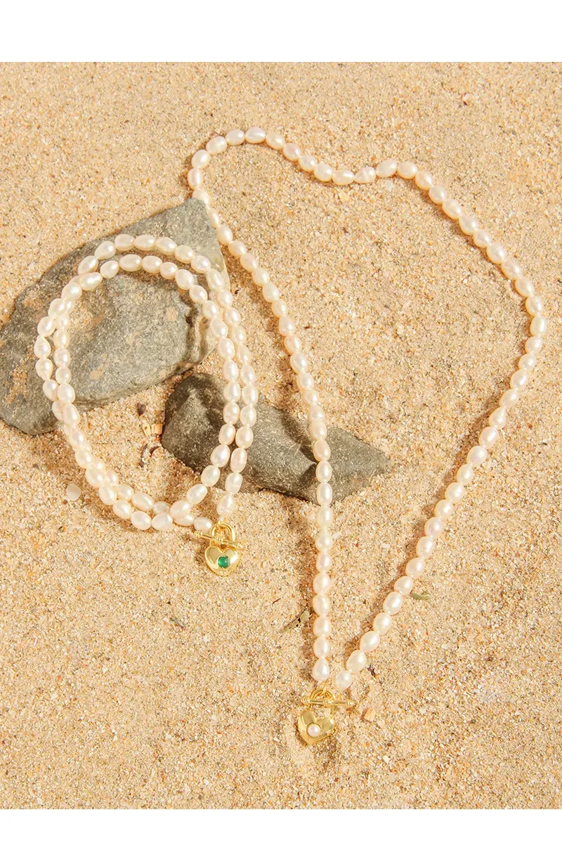 This captivating Celithra Necklace features lustrous, irregularly shaped freshwater pearls in a creamy white hue, forming the elegant chain. The centerpiece is a radiant gold-toned heart-shaped padlock pendant. For a touch of personalized charm, the pendant comes with interchangeable cabochon gemstones in vibrant turquoise, deep forest green, or a classic white pearl, allowing you to match your mood or attire.