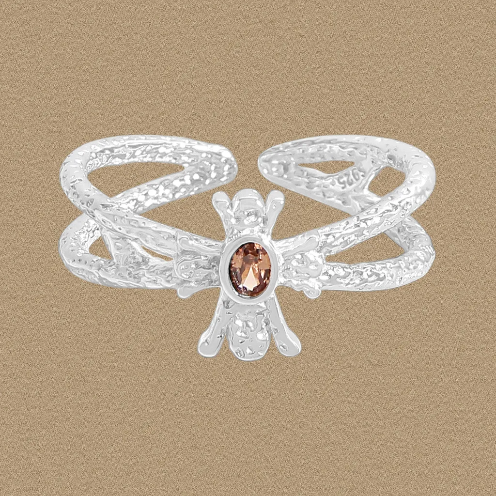 • Color: The lustrous, ethereal glow of silver forms the organic bands, complemented by a captivating oval gemstone at its heart. This stone boasts a warm, inviting amber-brown hue, reminiscent of earth’s rich depths and celestial warmth.