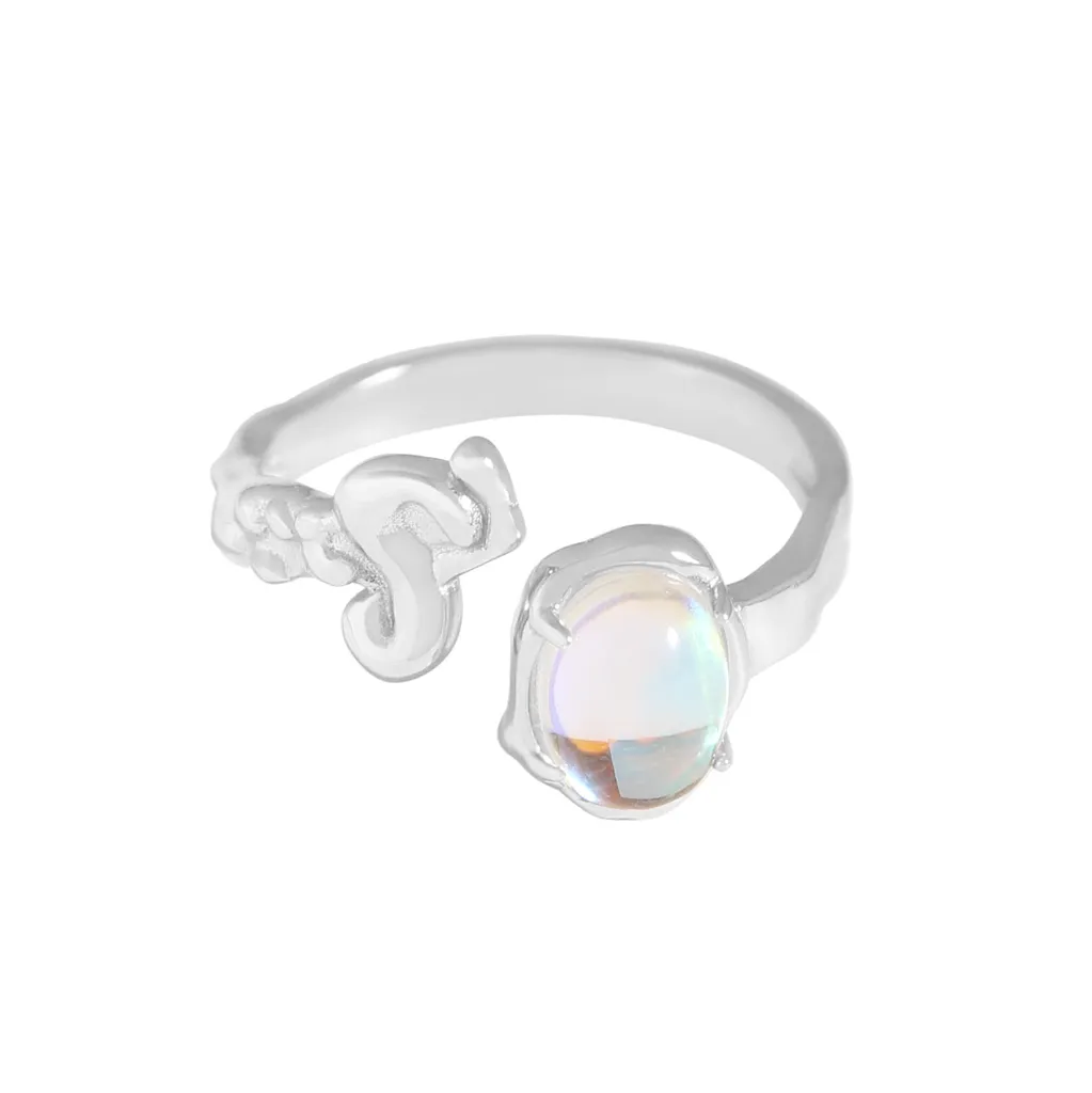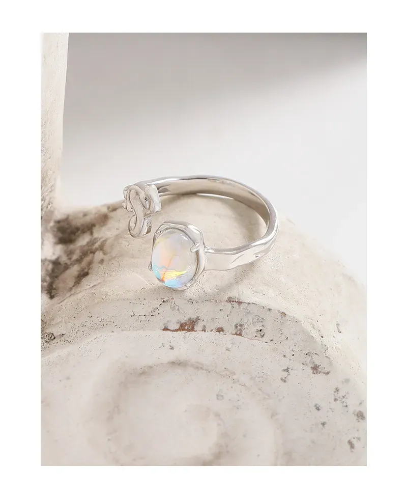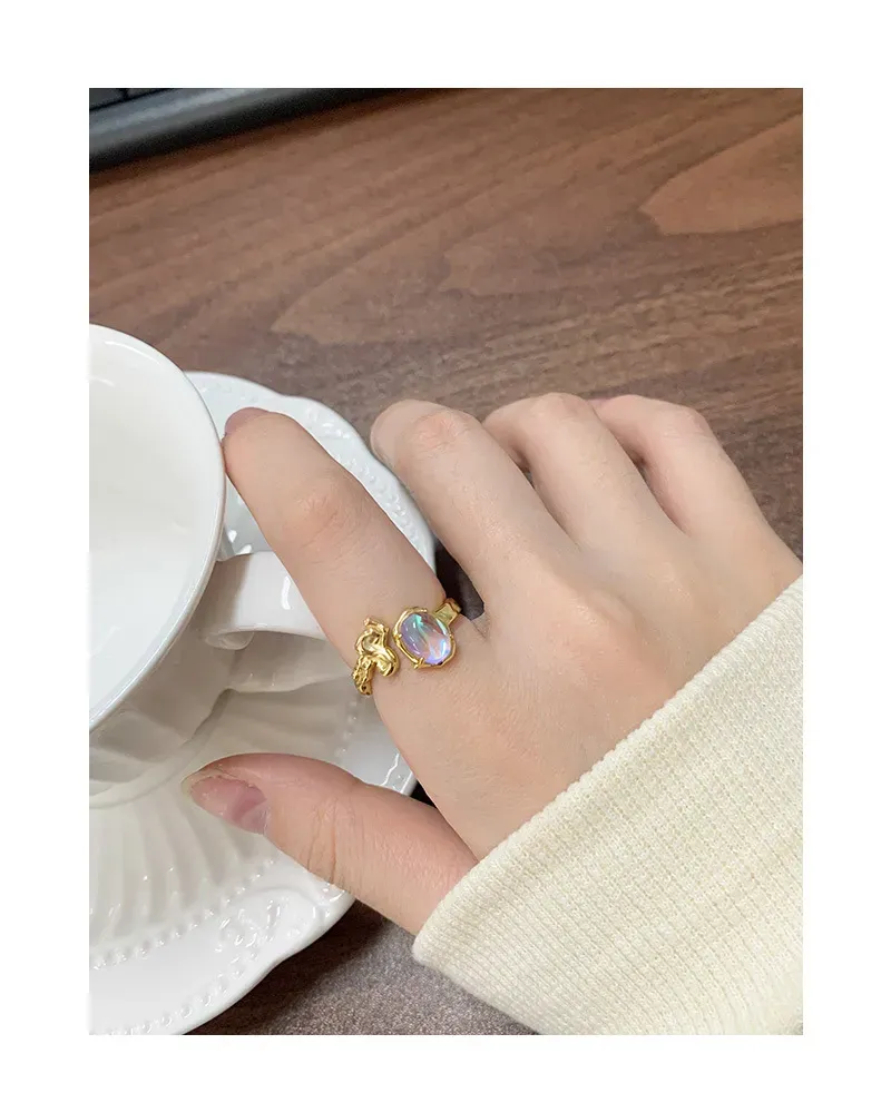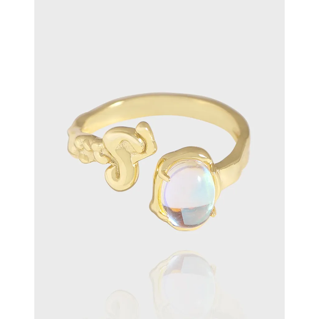 Color: Crafted in radiant gold, this Cerynelle Ring beautifully highlights an oval iridescent stone. Its captivating surface reveals a spectrum of soft, celestial hues that shift and shimmer, reminiscent of the mystical northern lights.