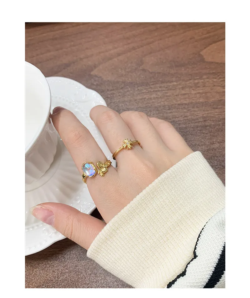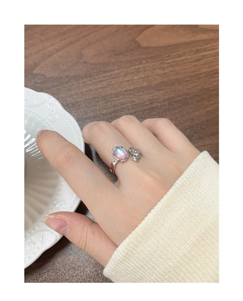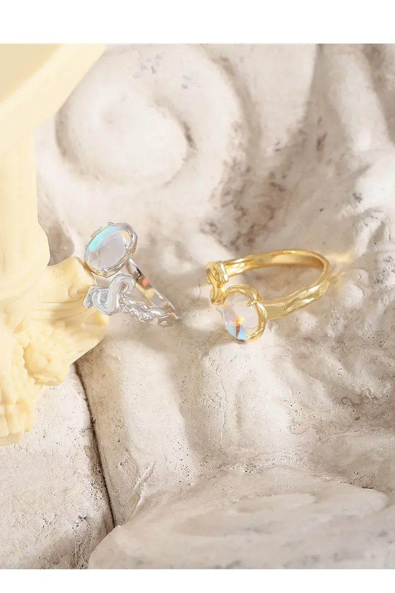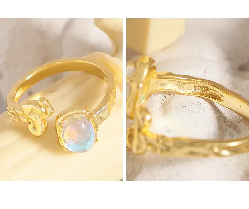 Color: Crafted in radiant gold, this Cerynelle Ring beautifully highlights an oval iridescent stone. Its captivating surface reveals a spectrum of soft, celestial hues that shift and shimmer, reminiscent of the mystical northern lights.