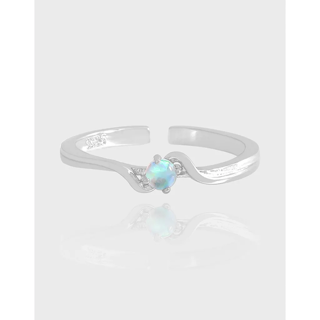 - Patterns & Textures: The ring boasts a smooth, highly polished sterling silver band (marked S925) that gracefully undulates with a delicate wave-like pattern, creating a sense of fluid motion. The central opal is securely held by subtle prongs, and the band features intricate, gentle curves that flow around the gemstone, adding to its natural charm and captivating artistry.