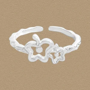 • Patterns & Textures: The ring showcases a beautifully irregular, molten-like texture along its band, giving it a raw, artisan feel. Two intertwined, abstract floral or petal-like motifs form the centerpiece, each accented with a subtle raised dot, mirroring nature’s imperfect beauty and fluid shapes.