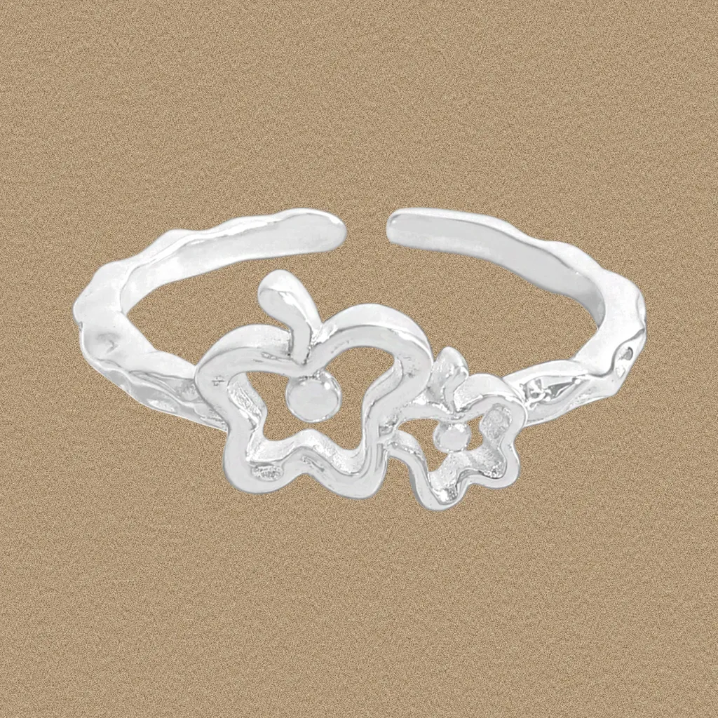 - Patterns & Textures: The ring showcases a beautifully irregular, molten-like texture along its band, giving it a raw, artisan feel. Two intertwined, abstract floral or petal-like motifs form the centerpiece, each accented with a subtle raised dot, mirroring nature’s imperfect beauty and fluid shapes.