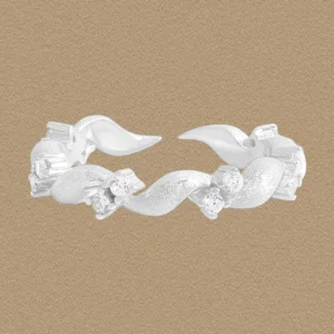 Discover a ring that captures nature’s fluid grace and ethereal shimmer. This exquisite piece boasts a radiant silver-toned metal, crafted with a dynamic interplay of textures and forms.