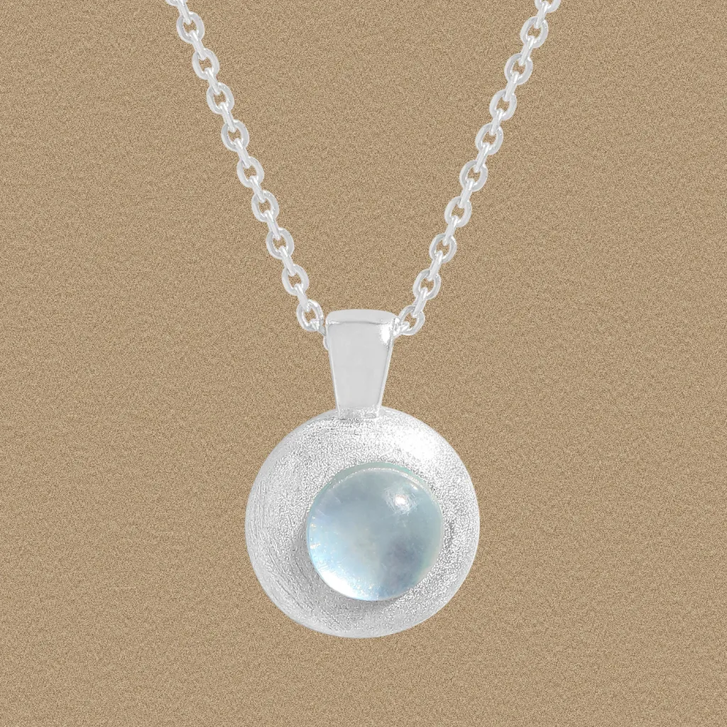 - Color: Crafted from radiant silver, the pendant frames a captivating, translucent gemstone that shimmers with celestial hues of light blue and white, reflecting an enchanting adularescent glow.