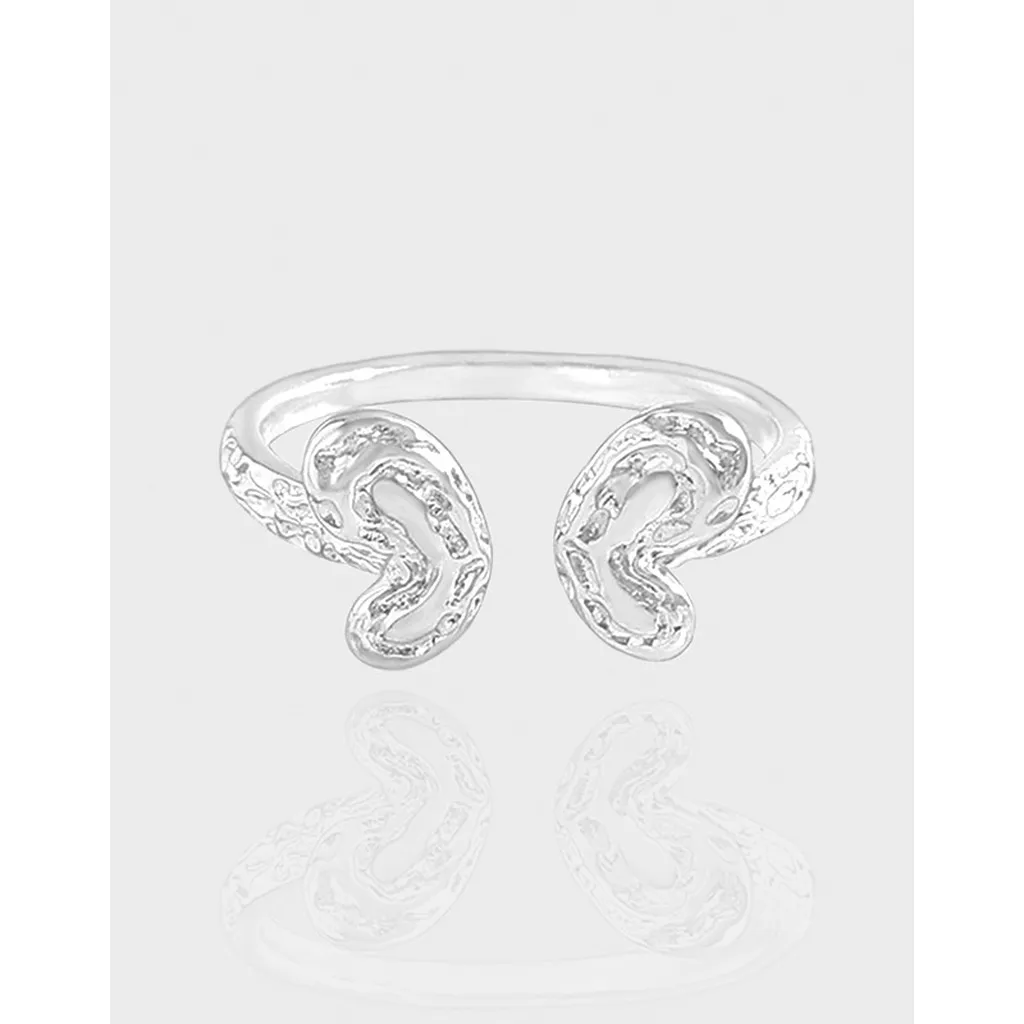 - Patterns & Textures: The ring features a sleek, smooth band that transitions into two distinctive, abstract shapes at its ends. These captivating elements showcase a delicate balance of textures, with raw, naturally sculpted patterns along their outer edges and a subtly refined, smoother finish within their flowing contours, evoking the intricate beauty of natural elements like flowing water or wind-carved stone.