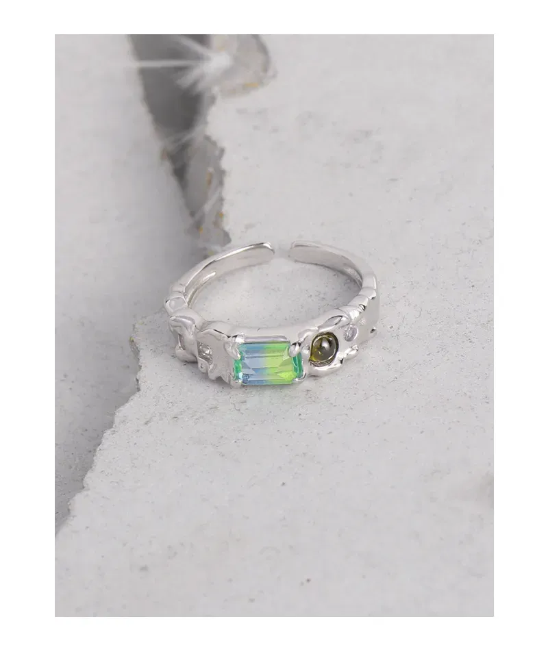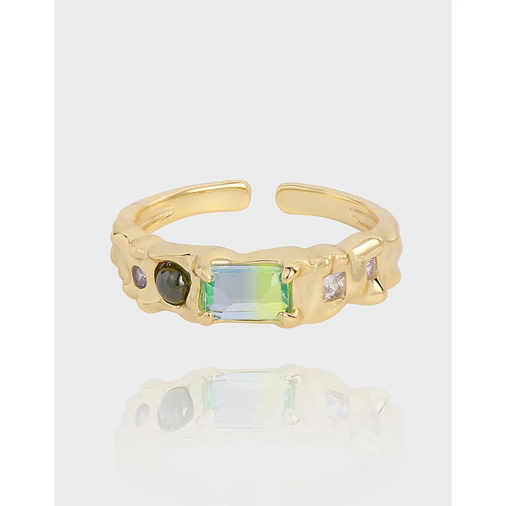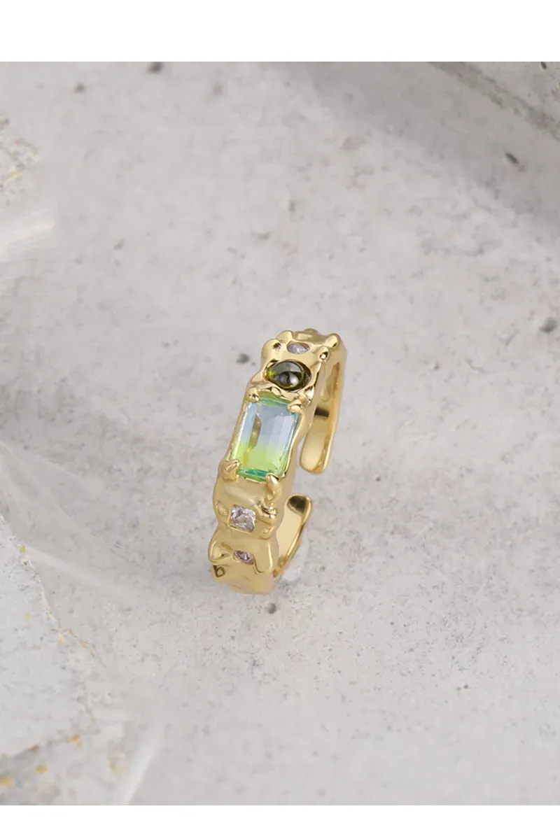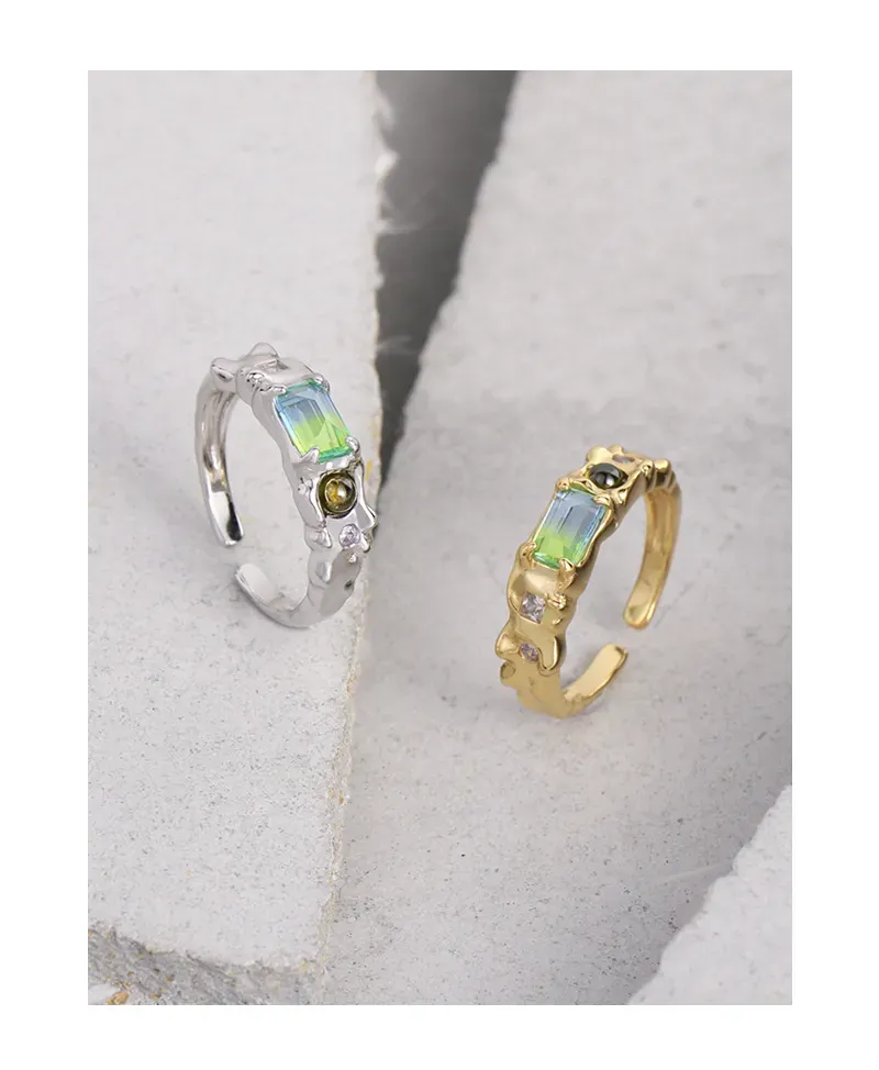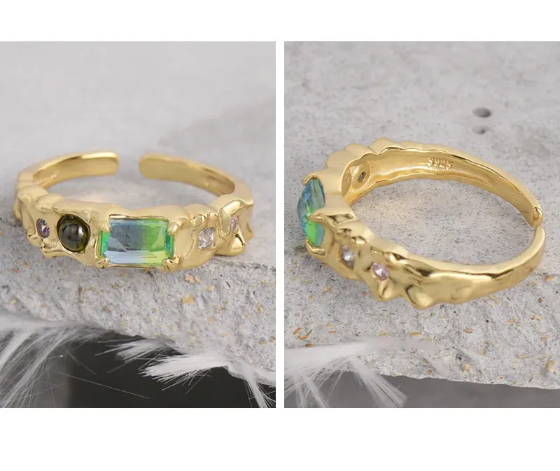 • Color: The ring features a radiant gold band, providing a warm, luxurious foundation. At its heart lies an exquisite iridescent rectangular gemstone, shimmering with a captivating gradient of luminous blue-green, reminiscent of the aurora’s mystical hues. Complementing this central spectacle are smaller, round dark green gemstones, echoing the depth of ancient forests, alongside delicate clear and subtle lilac cubic zircons, reflecting the shimmer of starlight.