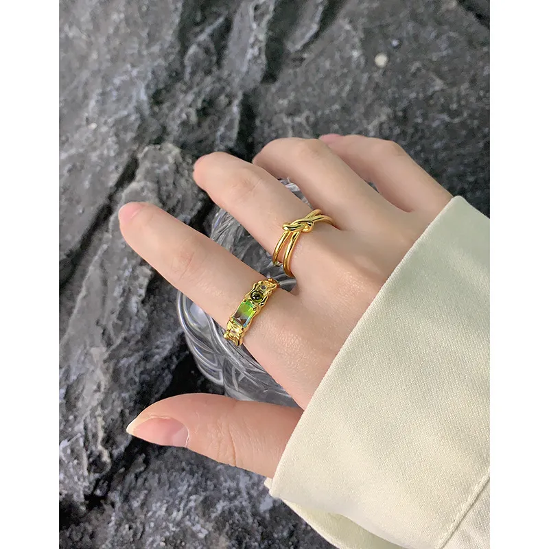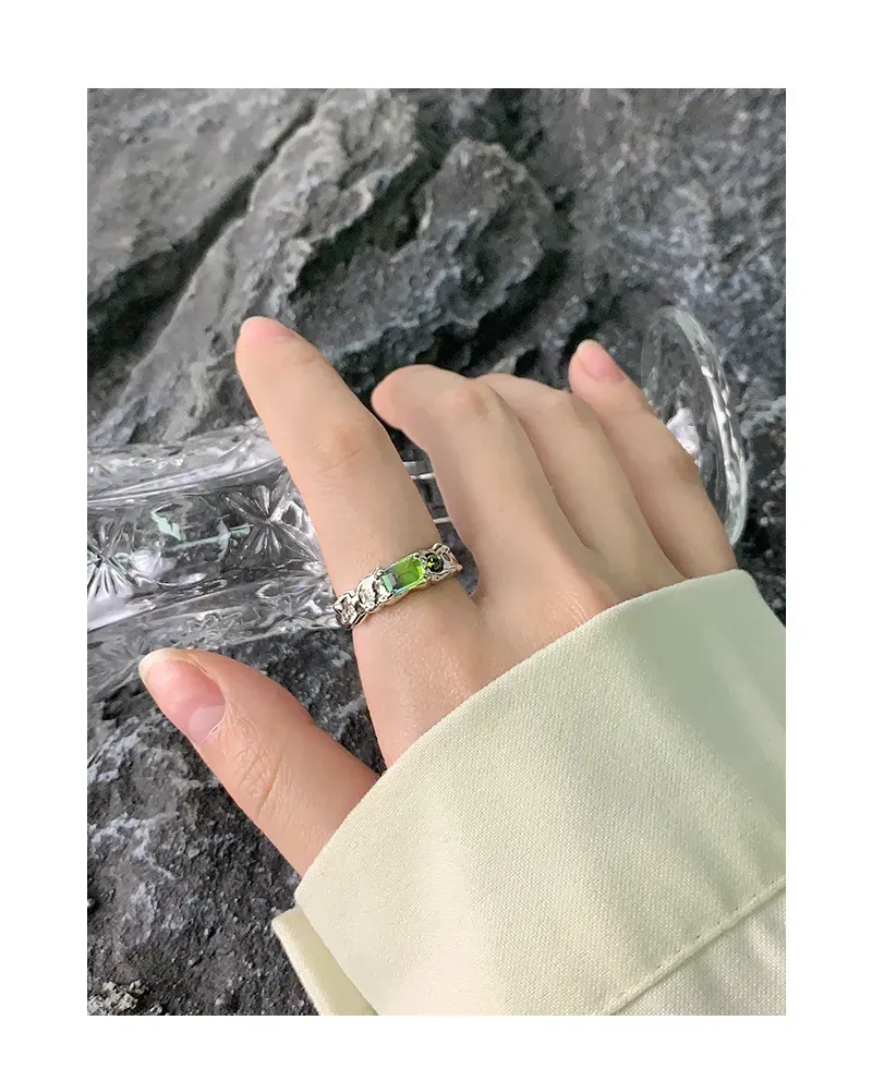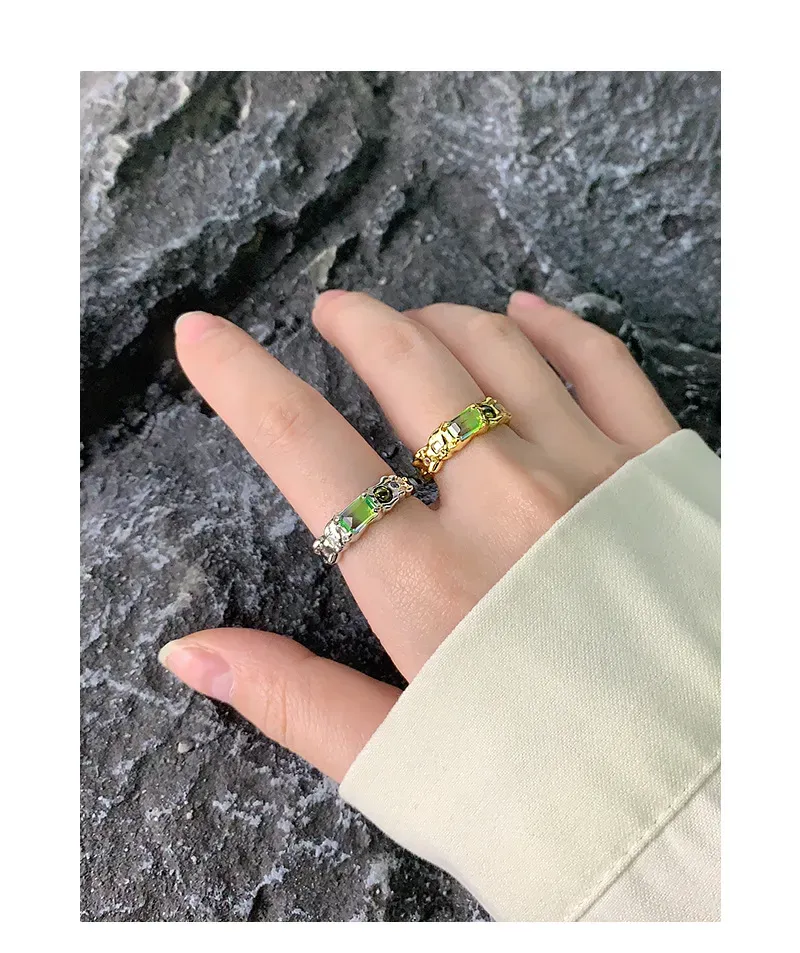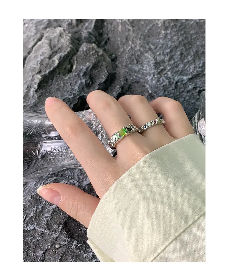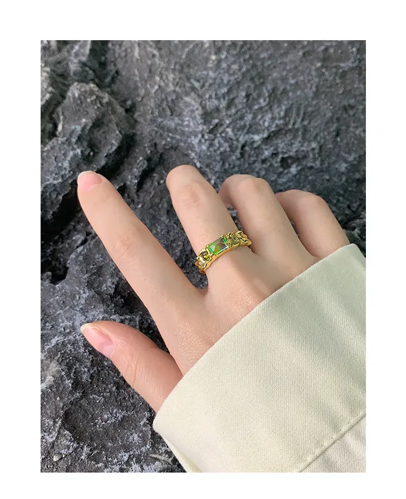 • Color: The ring features a radiant gold band, providing a warm, luxurious foundation. At its heart lies an exquisite iridescent rectangular gemstone, shimmering with a captivating gradient of luminous blue-green, reminiscent of the aurora’s mystical hues. Complementing this central spectacle are smaller, round dark green gemstones, echoing the depth of ancient forests, alongside delicate clear and subtle lilac cubic zircons, reflecting the shimmer of starlight.