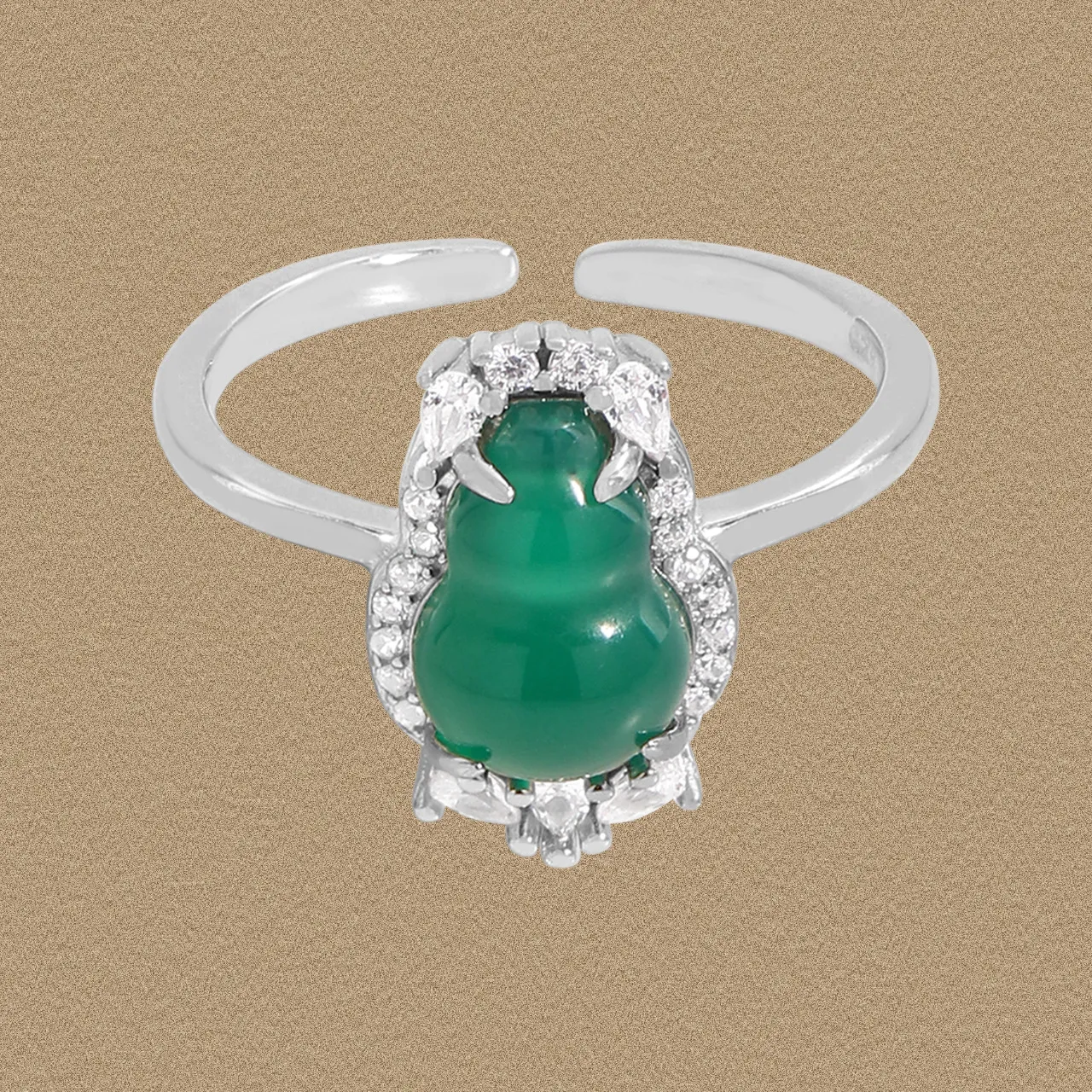 • Patterns or Textures: The smooth, polished surface of the green agate reflects light with a subtle, deep sheen, contrasting beautifully with the sparkling facets of the brilliant clear accent stones. These smaller gems create a shimmering texture around the central piece, enhancing its visual depth and adding an ethereal glow to the lustrous, smooth silver band.