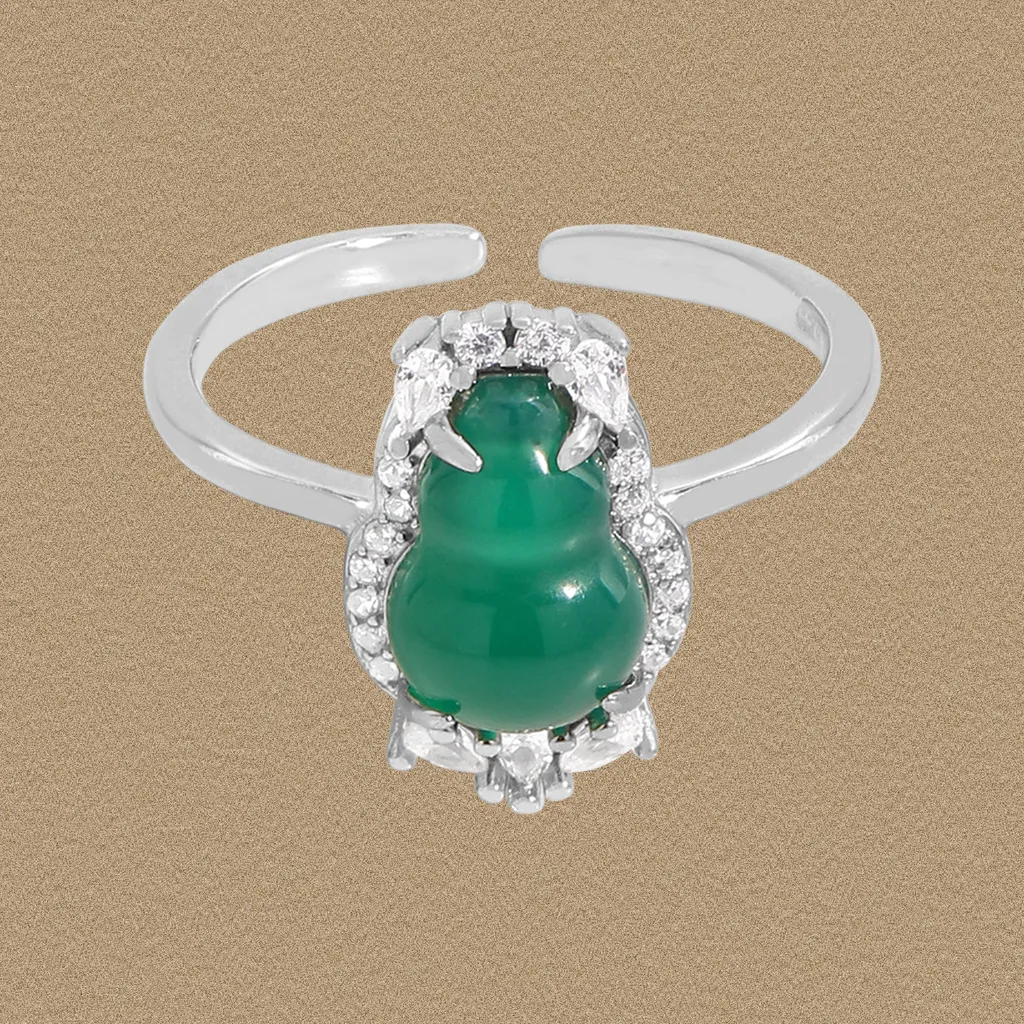 - Style: This Cynara Ring features an elegantly organic, gourd-shaped green agate, cradled within a fluid, open-band design. The central gem is crowned and encircled by a dazzling halo of intricately set clear stones, showcasing a mix of round and marquise cuts that create a delicate, floral-inspired motif.
