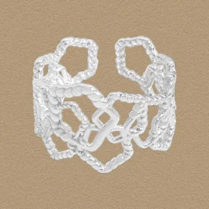 This captivating Malisse ring radiates in a brilliant silver hue, offeCynoria Ring a lustrous and versatile appeal. Designed as an adjustable open-ended cuff, its wide silhouette elegantly embraces the finger with a style that is both contemporary and organically inspired.