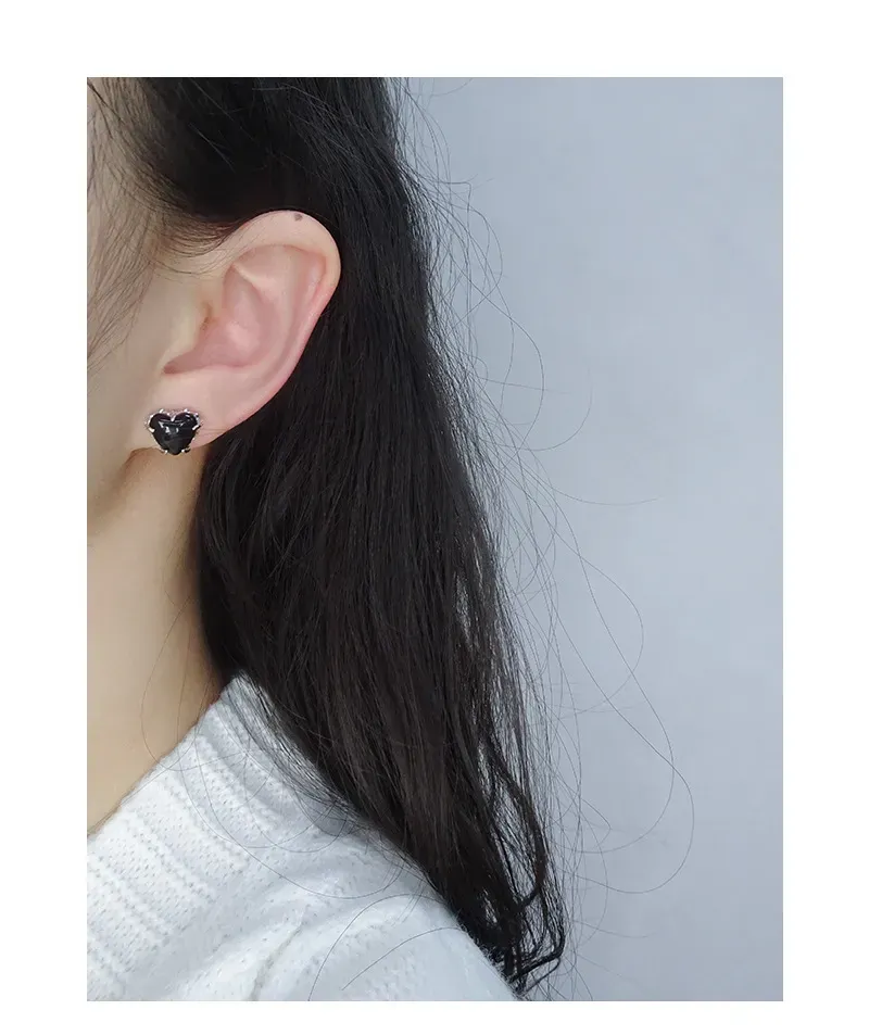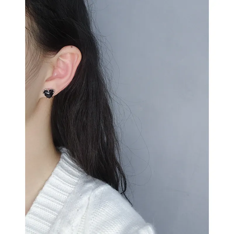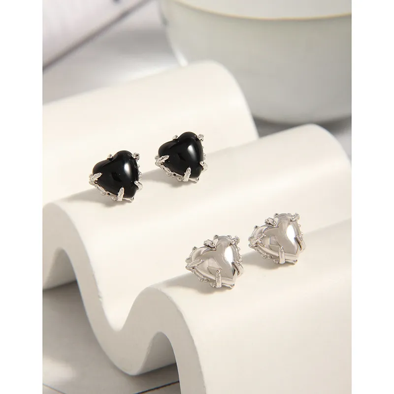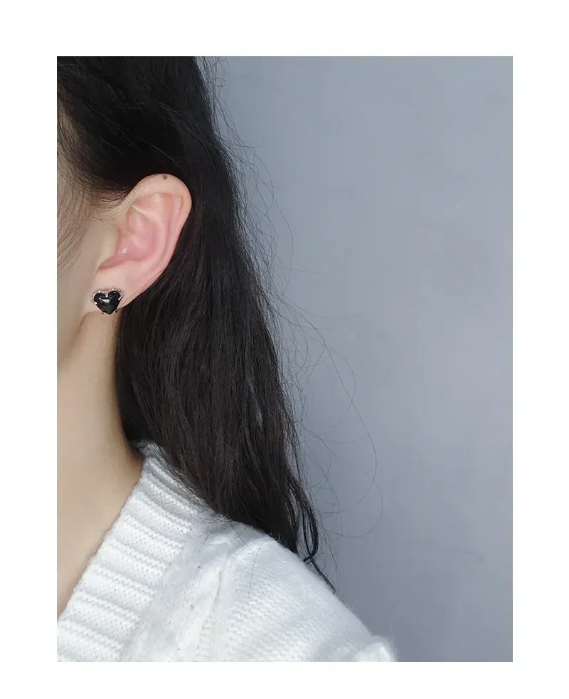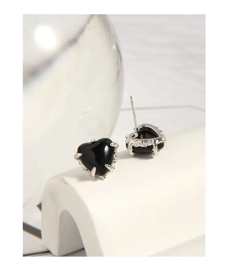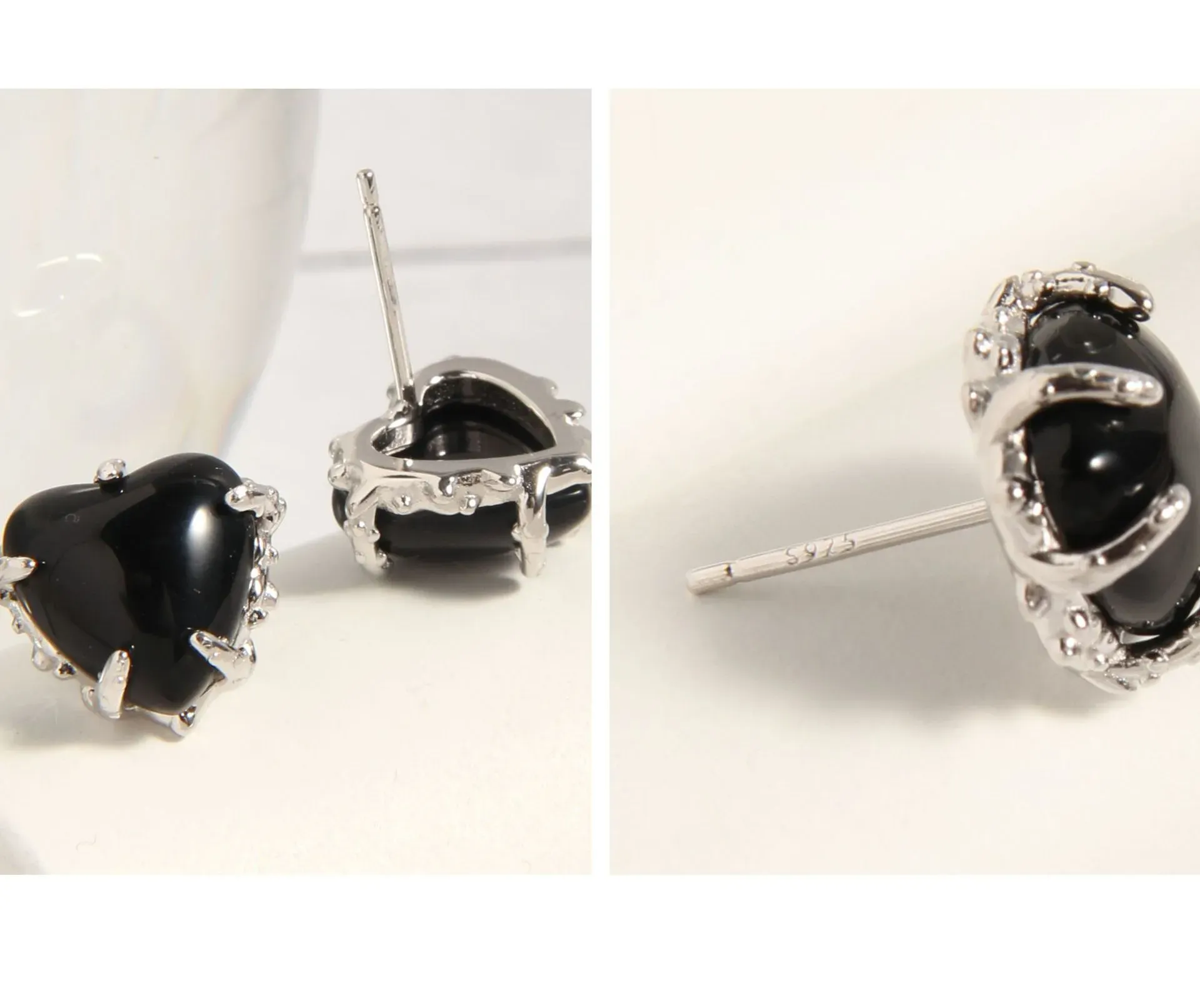 Color: These striking earrings feature a deep, polished black heart, reminiscent of the enigmatic night sky or ancient gemstones, dramatically set against a raw, silver-toned metallic surround.