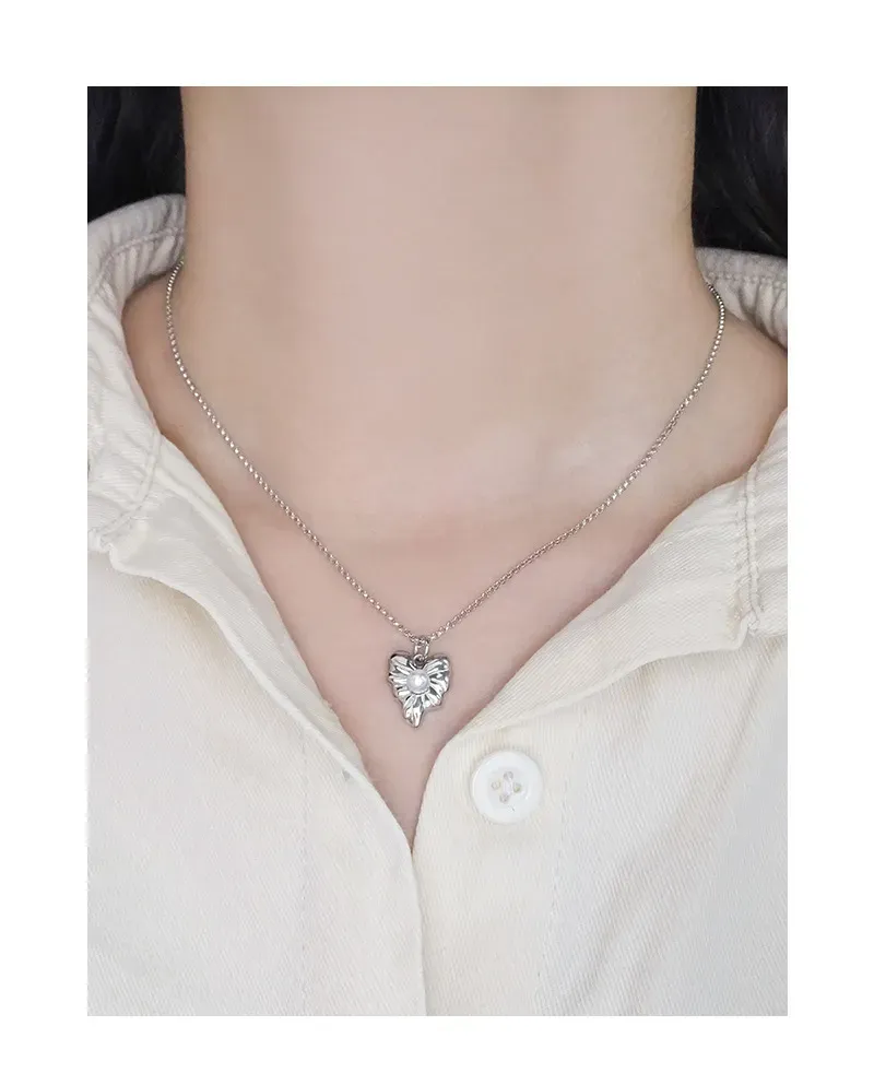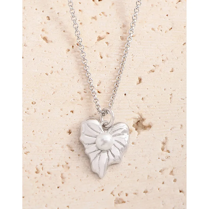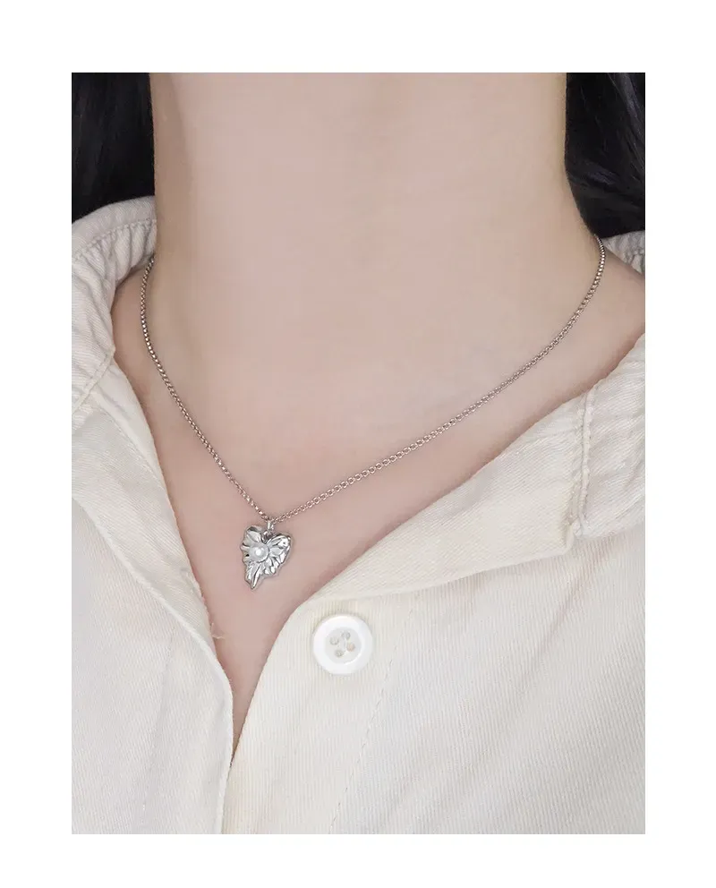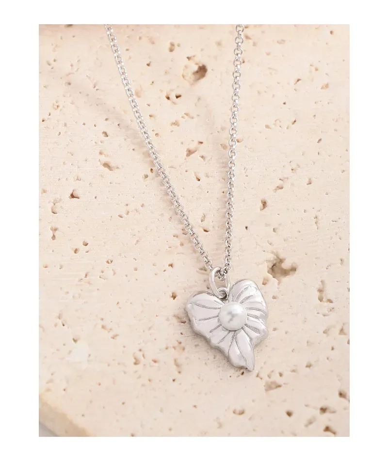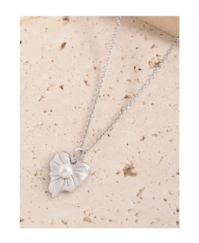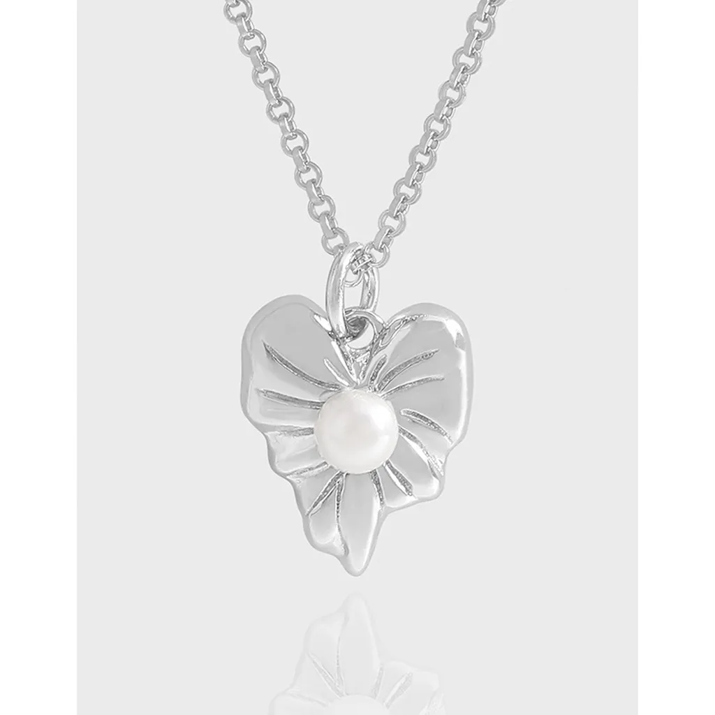 • Patterns or Textures: The silver pendant features a beautifully sculpted, fluid shape with subtle, raised veins that mimic the intricate patterns found in nature. This delicate texture, combined with its smooth, reflective surface, highlights the imperfect beauty inherent in organic forms. A pristine, spherical pearl provides a smooth, luminous focal point, enhancing the piece’s organic charm.