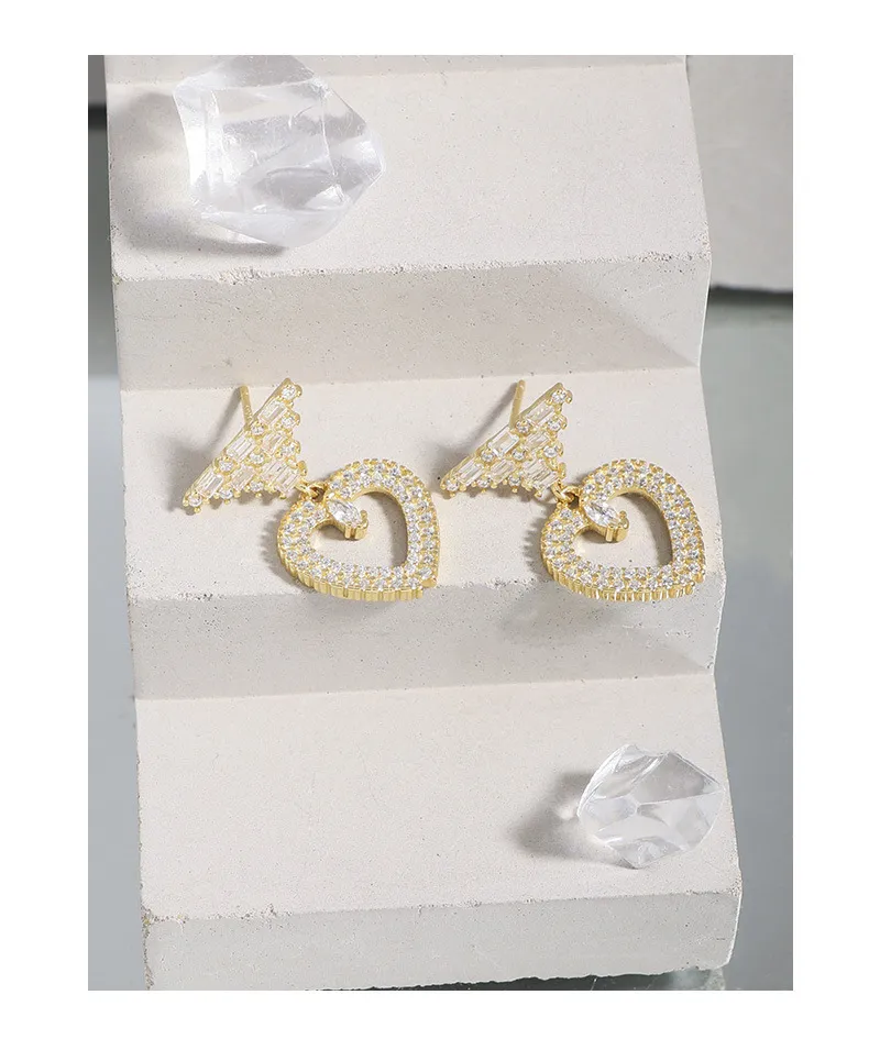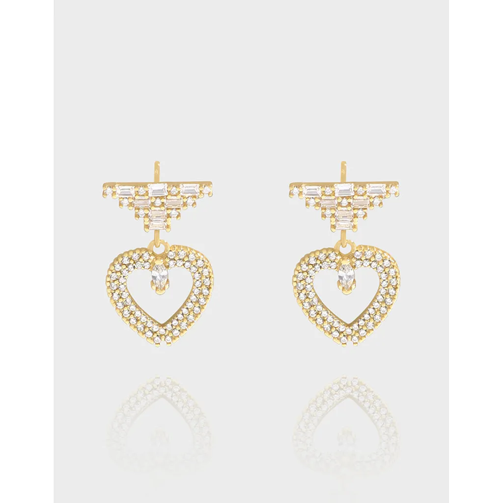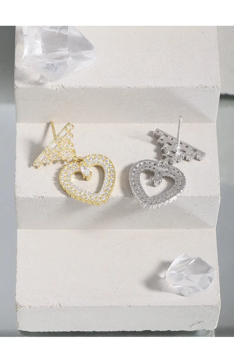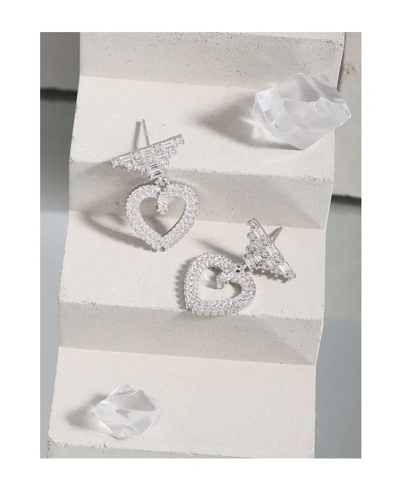 • Patterns & Textures: The top stud features a striking, geometric arrangement of baguette-cut zirconia, creating a tiered pattern reminiscent of stacked raw textures. Suspended below is an open heart, meticulously encrusted with brilliant round-cut zirconia, giving it a rich, shimmering texture. A single, marquise-cut zirconia gracefully dangles within the heart’s embrace, adding a focal point that glitters like a drop of starlight.
