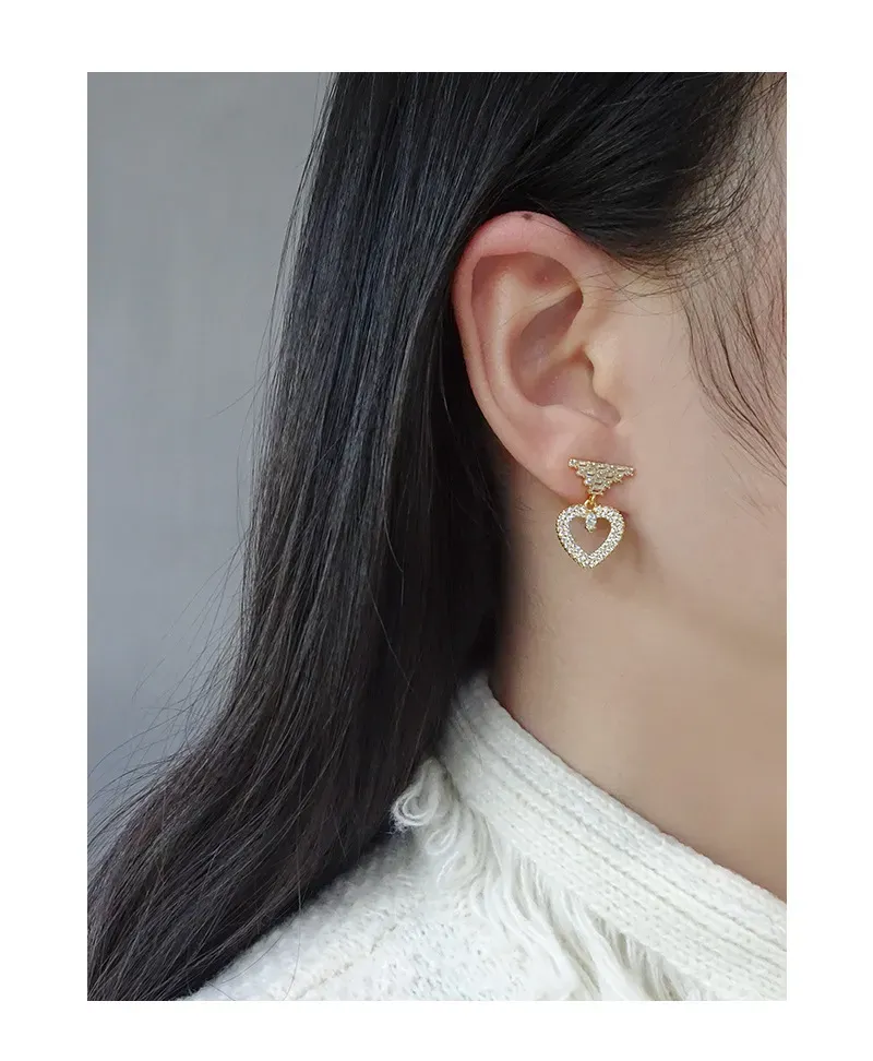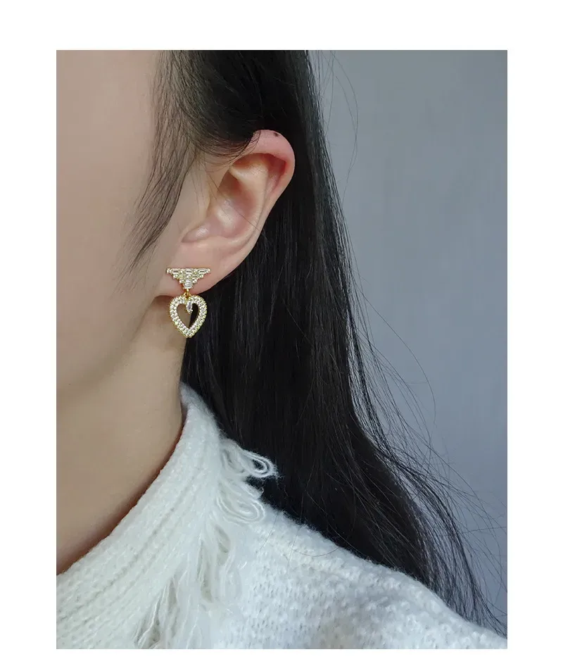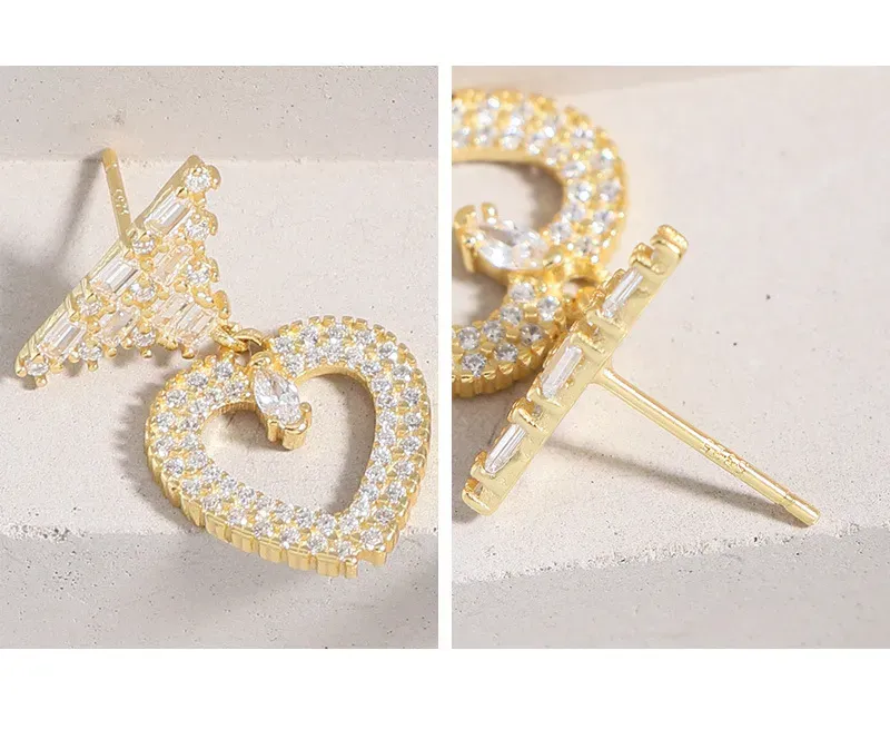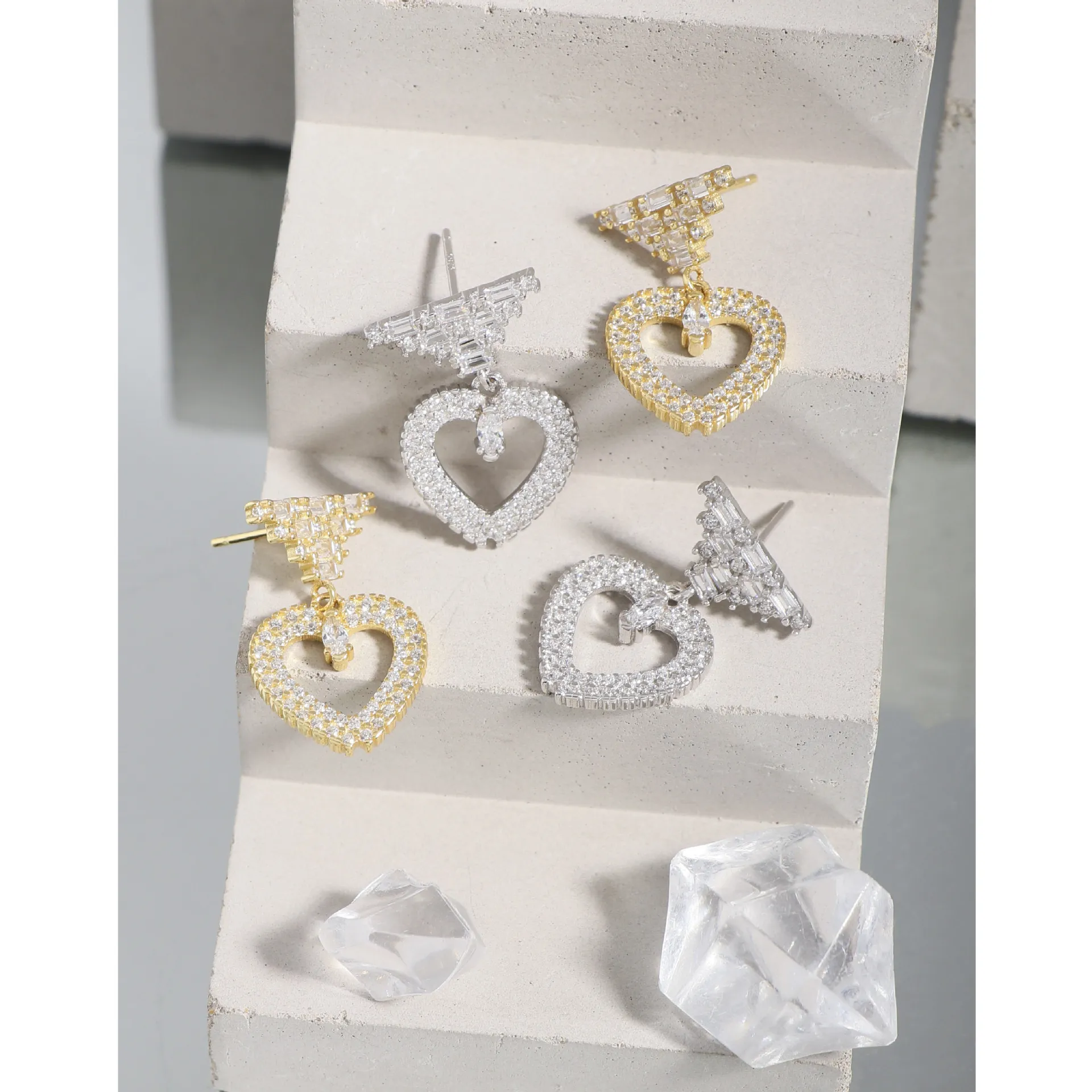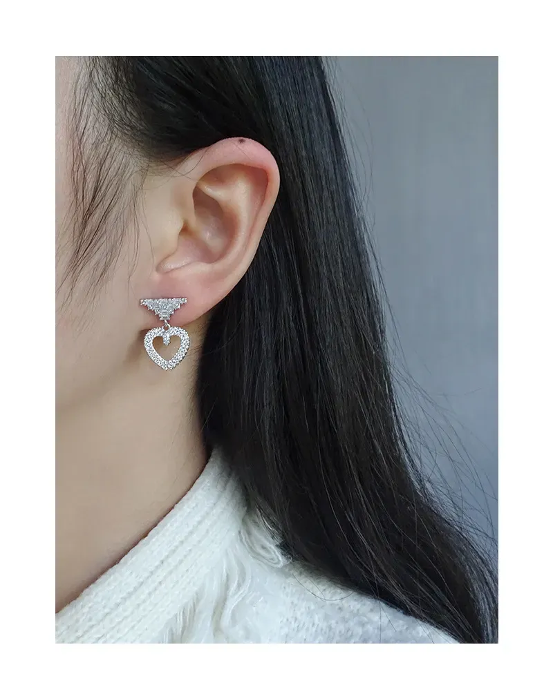 • Patterns & Textures: The top stud features a striking, geometric arrangement of baguette-cut zirconia, creating a tiered pattern reminiscent of stacked raw textures. Suspended below is an open heart, meticulously encrusted with brilliant round-cut zirconia, giving it a rich, shimmering texture. A single, marquise-cut zirconia gracefully dangles within the heart’s embrace, adding a focal point that glitters like a drop of starlight.