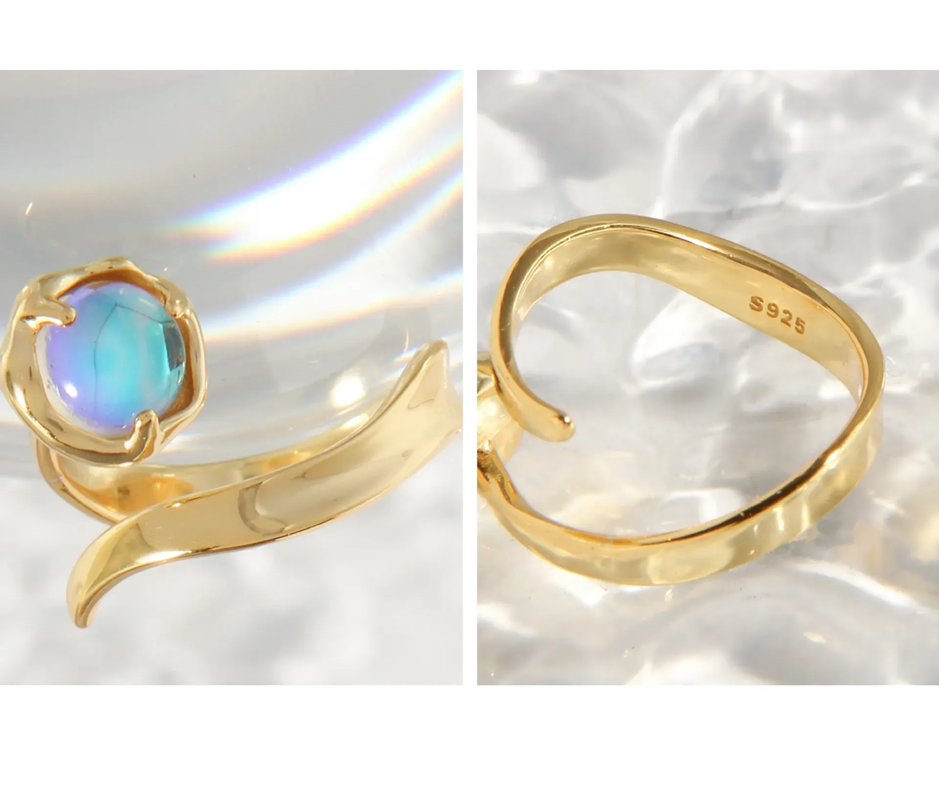 - Patterns & Textures: The highly polished gold band boasts a smooth, reflective surface that curves into a distinctive, wave-like or leaf-inspired shape. The central luminous cabochon is cradled by an irregularly textured, organic bezel setting, highlighting the “imperfect beauty of nature’s patterns” and providing a tactile contrast to the band’s sleek finish.