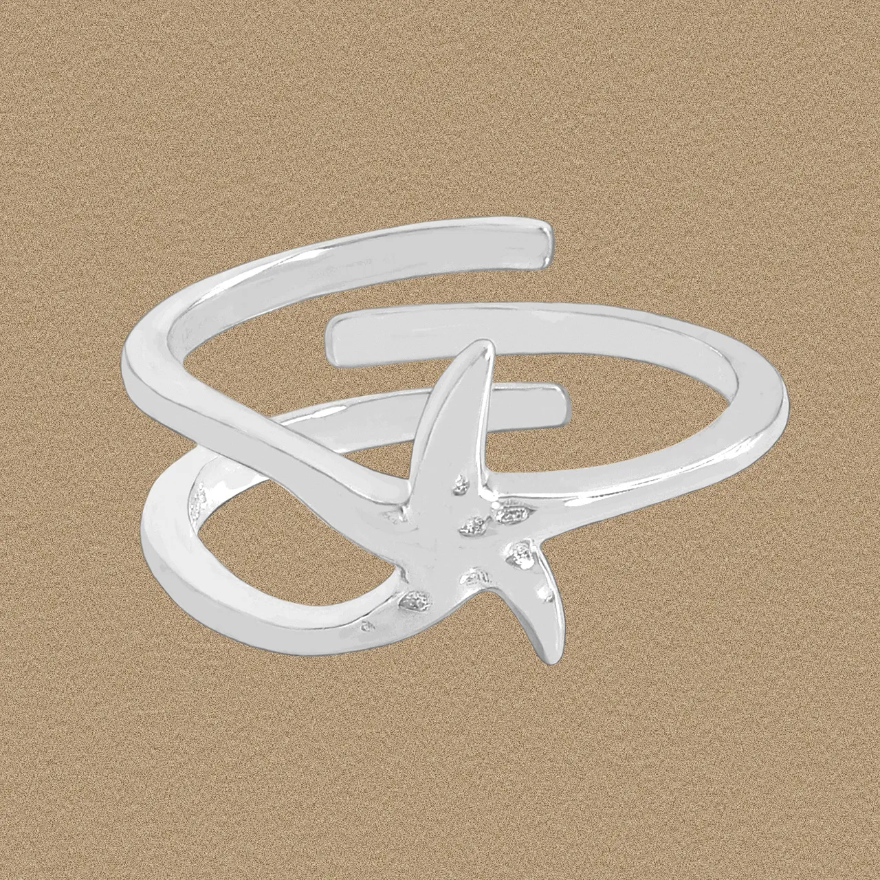 - Patterns & Textures: The smooth, lustrous surfaces of the encircling bands beautifully contrast with the starfish element. The starfish itself presents a subtly textured surface, adorned with delicate, scattered indentations that mimic the organic imperfections and raw beauty found in nature, reminiscent of shimmering stardust or the tactile quality of a real starfish.