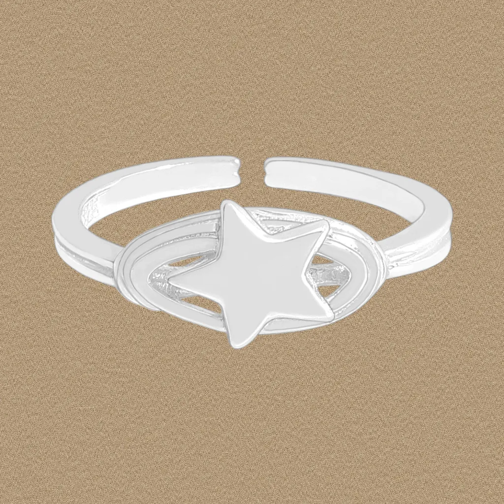 - Style: An adjustable, open-ended design ensures a comfortable and customizable fit. The focal point is a gracefully rendered five-pointed star, set atop a captivating arrangement of two concentric oval bands, evoking a sense of cosmic orbits and fluid motion.