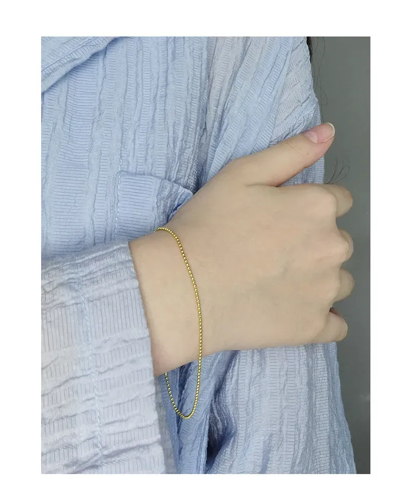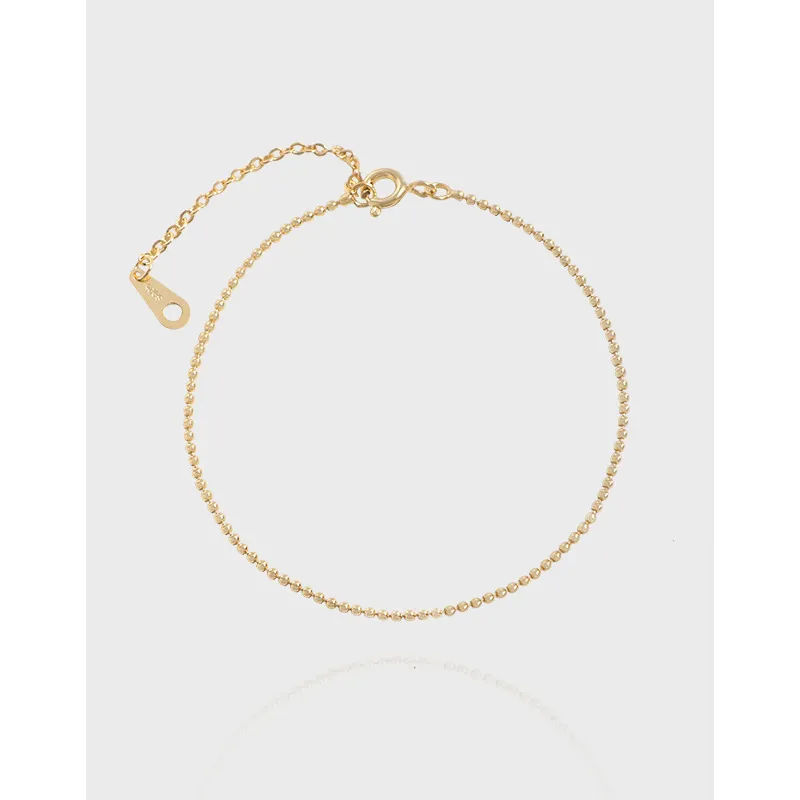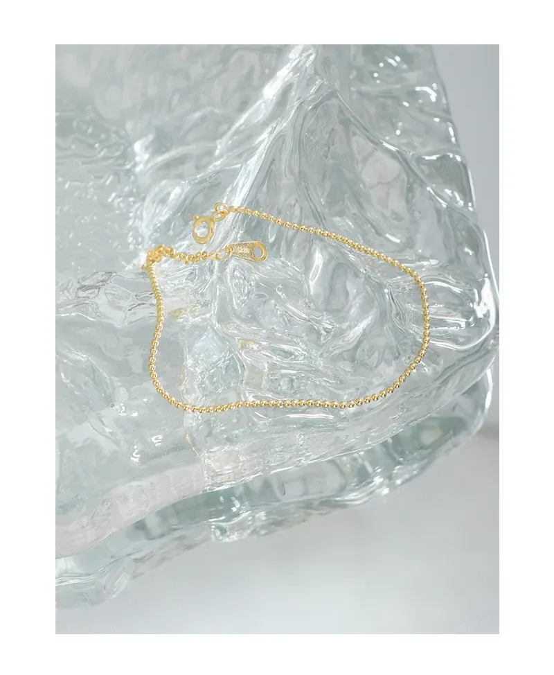 • Patterns & Textures: The main chain is meticulously formed from a continuous string of tiny, polished gold spheres, creating a soft, reflective texture akin to dewdrops or a starlit path. This intricate beaded pattern gives the bracelet a unique sparkle and depth, echoing the “shimmer of the night sky” and the “imperfect beauty of nature’s patterns.”