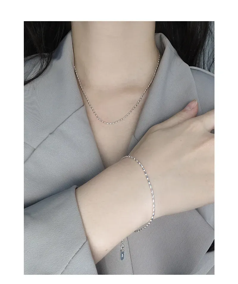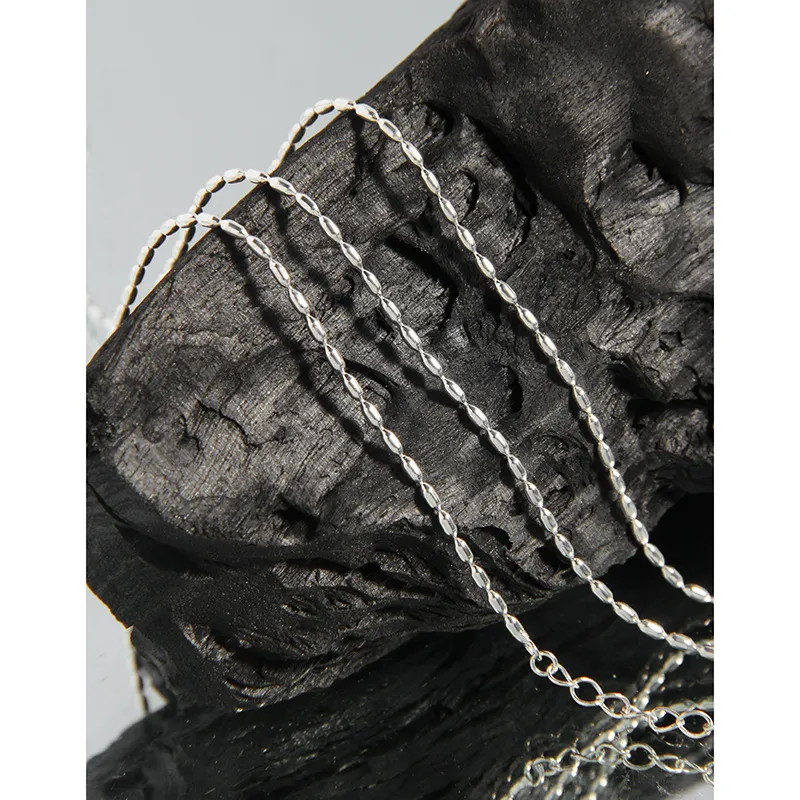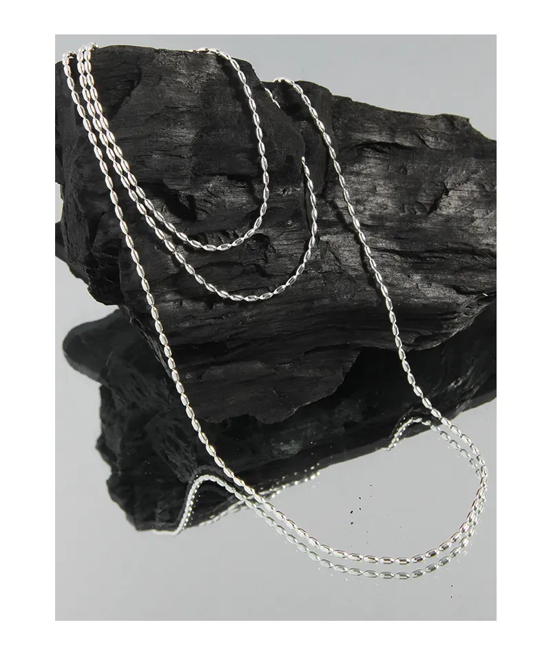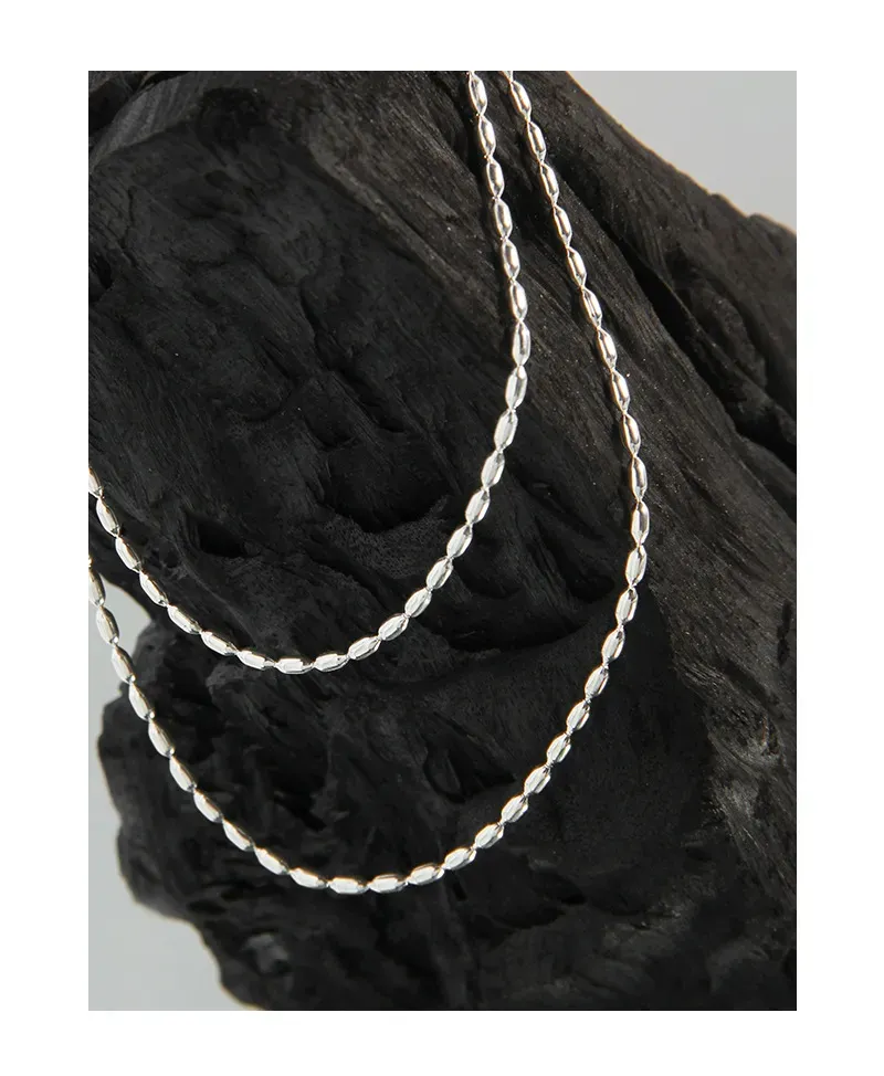 Patterns or Textures: The chain is exquisitely crafted from a series of uniformly sized, elongated silver beads. Each bead features a smooth, polished surface that beautifully reflects light, creating a continuous, shimmering texture. These organic, rice-grain-like shapes are linked seamlessly, embodying the fluid and imperfect beauty inspired by nature’s own patterns.