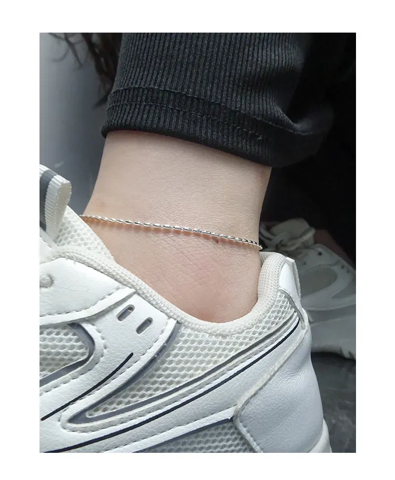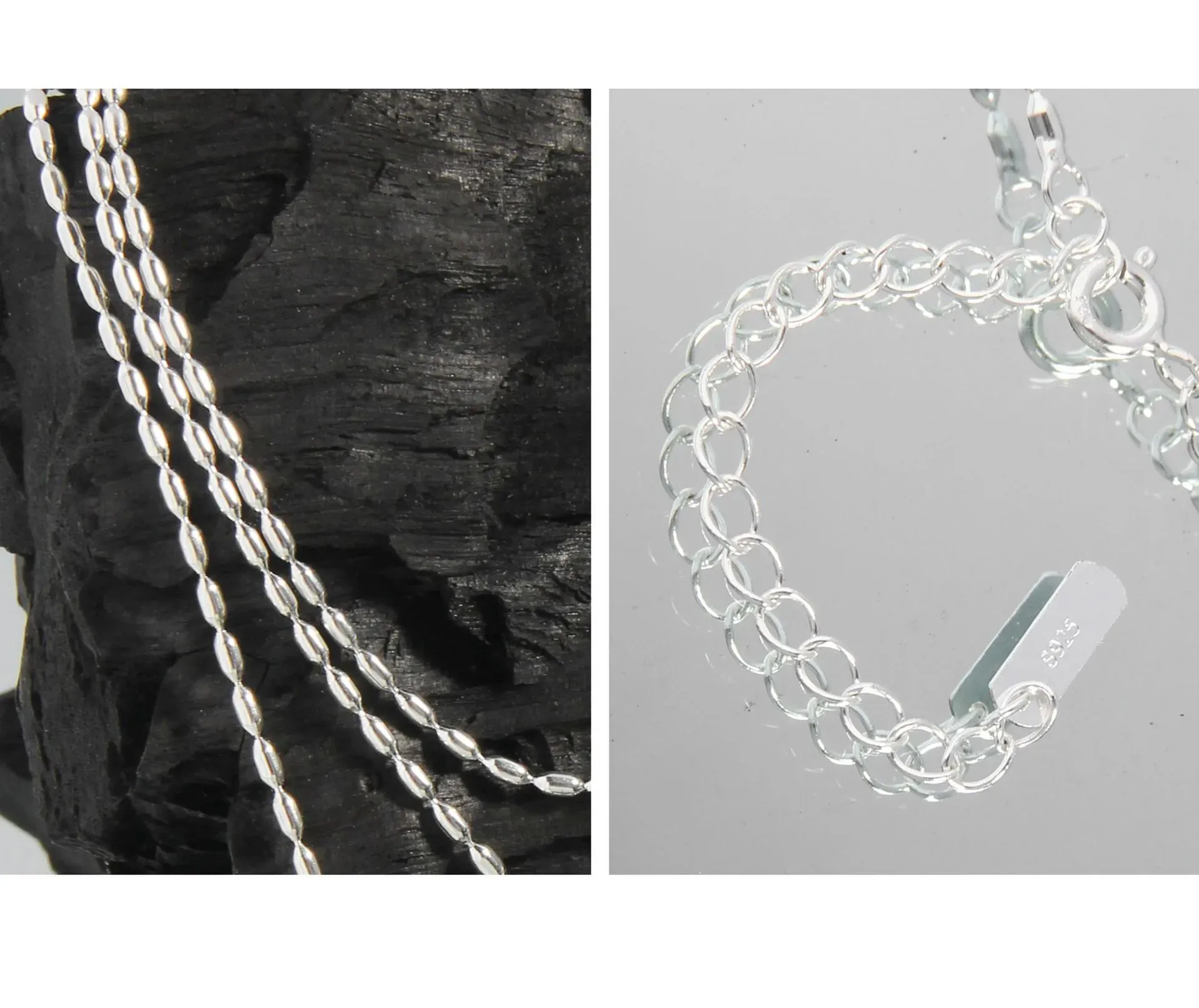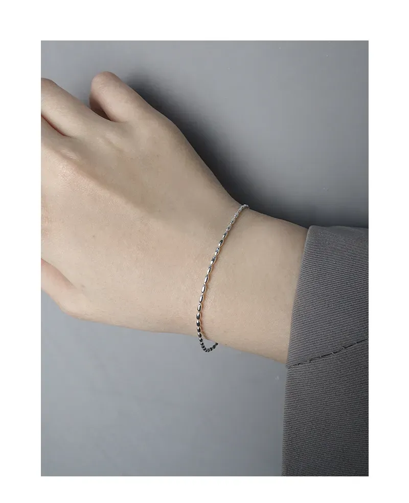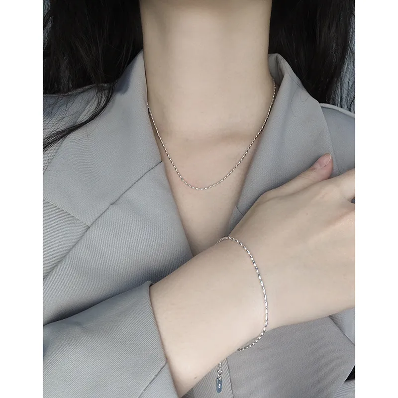 Patterns or Textures: The chain is exquisitely crafted from a series of uniformly sized, elongated silver beads. Each bead features a smooth, polished surface that beautifully reflects light, creating a continuous, shimmering texture. These organic, rice-grain-like shapes are linked seamlessly, embodying the fluid and imperfect beauty inspired by nature’s own patterns.