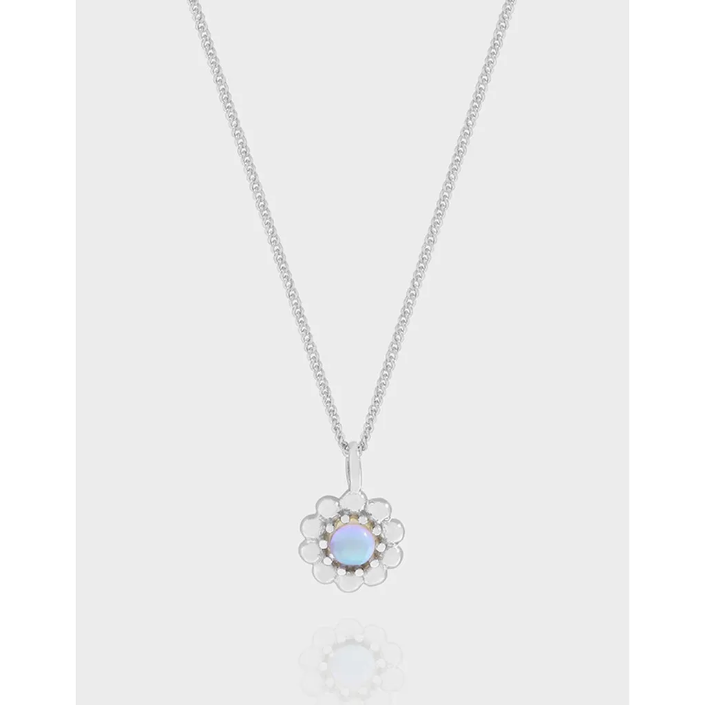 - Patterns or Textures: Featuring a finely crafted curb chain, the necklace offers a classic, subtle texture. The flower pendant showcases a distinct scalloped edge, forming elegant “petals” around the central gemstone. The opal itself, a smooth cabochon, exhibits an internal play-of-color texture, creating an ever-changing visual depth, complemented by the sleek, polished finish of the silver.