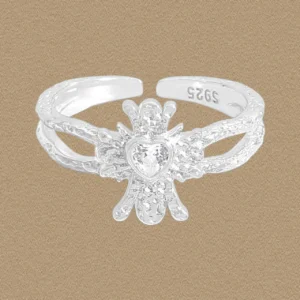 - Patterns & Textures: The Dorina Ring features a textured, intertwined band, reminiscent of organic forms. At its heart lies a luminous, clear, heart-shaped gemstone, encircled by an artful array of clustered smaller clear stones and sculpted rays. These elements combine to create a dynamic sparkle and an imperfect, yet beautiful, natural pattern.