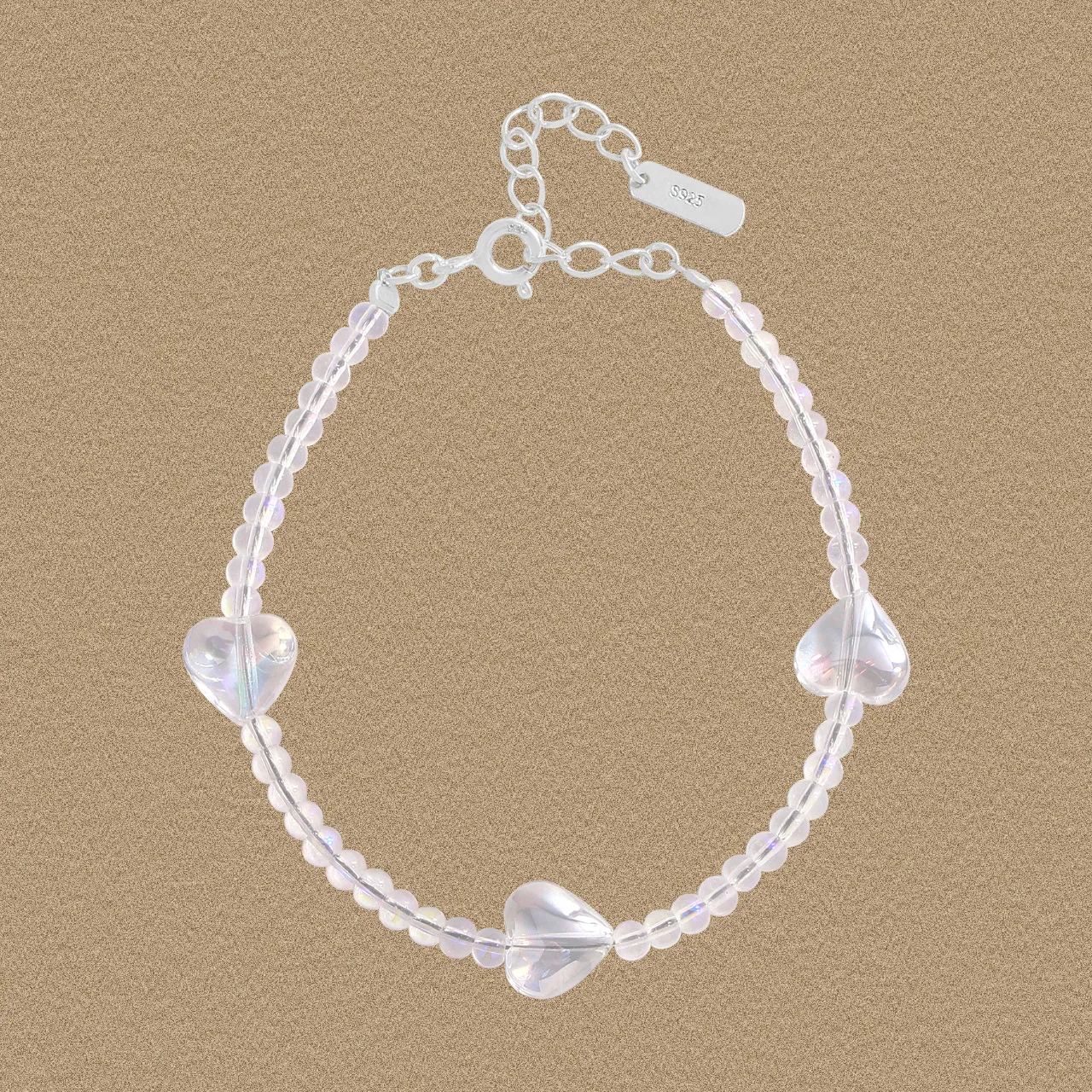 The main body of the bracelet is composed of numerous small, perfectly smooth, spherical beads, providing a consistent and refined texture. These are beautifully punctuated by three heart-shaped beads, which feature a unique internal texture that enhances their iridescent play of light, creating an organic, luminous shimmer. The silver clasp and chain provide a sleek, polished metallic texture, creating a harmonious balance with the soft, gem-like quality of the beads.
