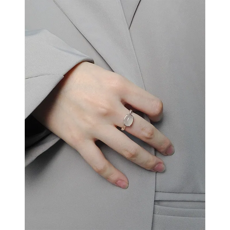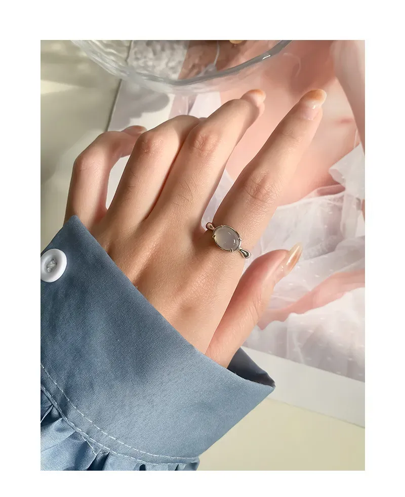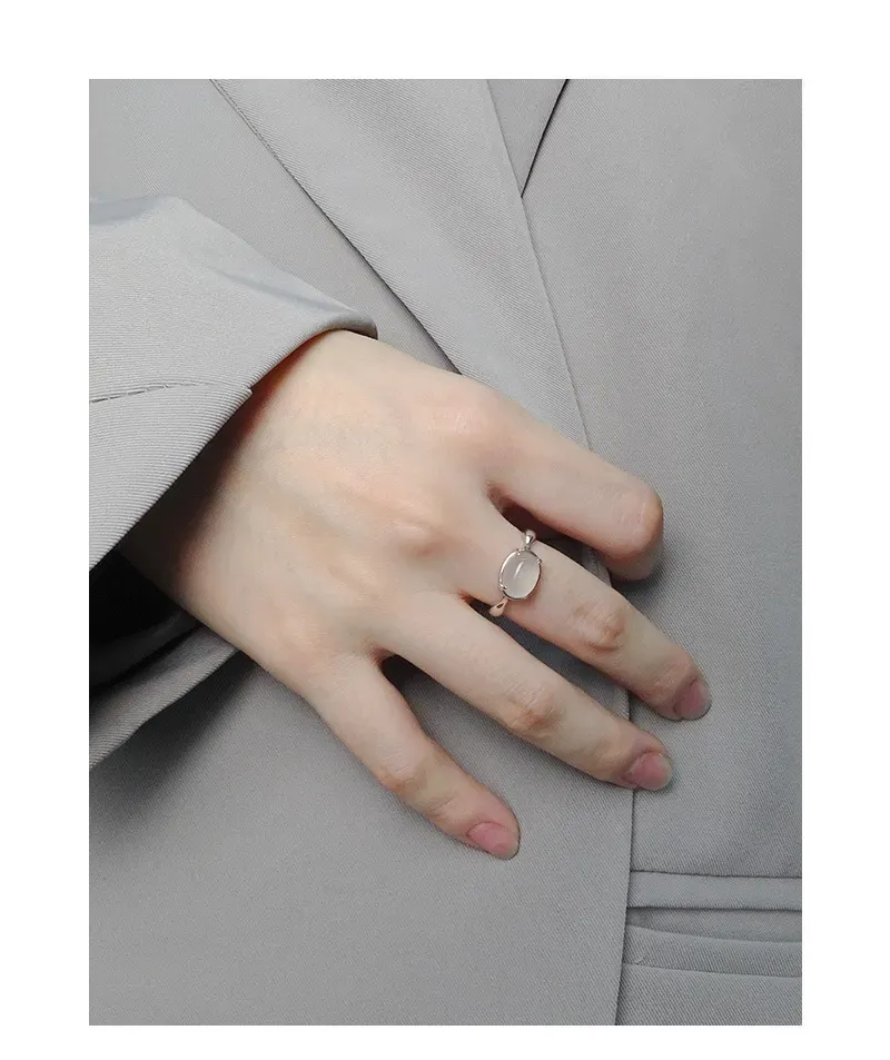 • Patterns or Textures: The band boasts a smooth, highly polished finish, reflecting light with subtle brilliance. This sleek texture contrasts beautifully with the soft, unblemished surface of the oval gemstone, creating a harmonious balance between refined elegance and the raw, imperfect beauty of nature.