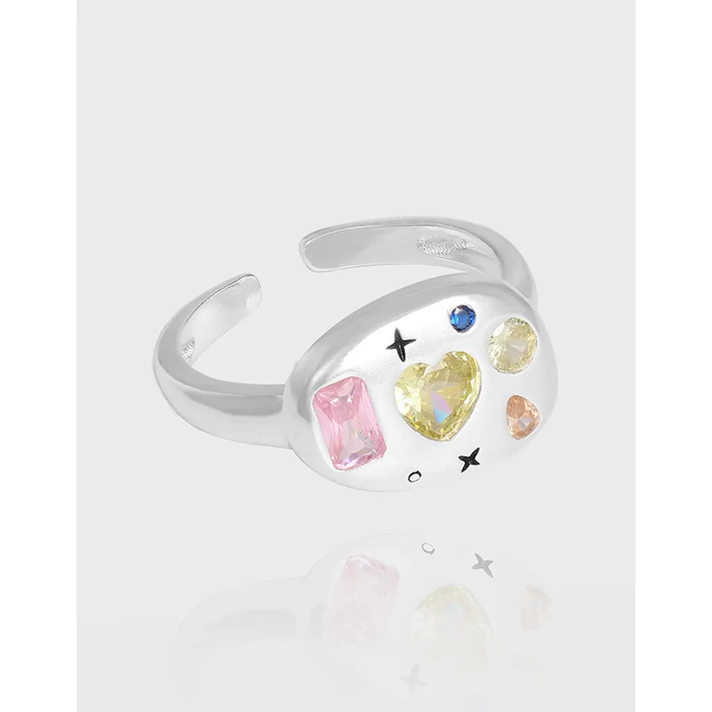- Color: The lustrous silver band creates a brilliant foundation for a dazzling array of multi-colored gemstones. FeatuElallaia Ring a radiant pink rectangular stone, a captivating yellow heart-shaped gem, smaller round stones in sunny yellow, soft peach, and deep celestial blue, each hue shimmers with the magic of the northern lights.