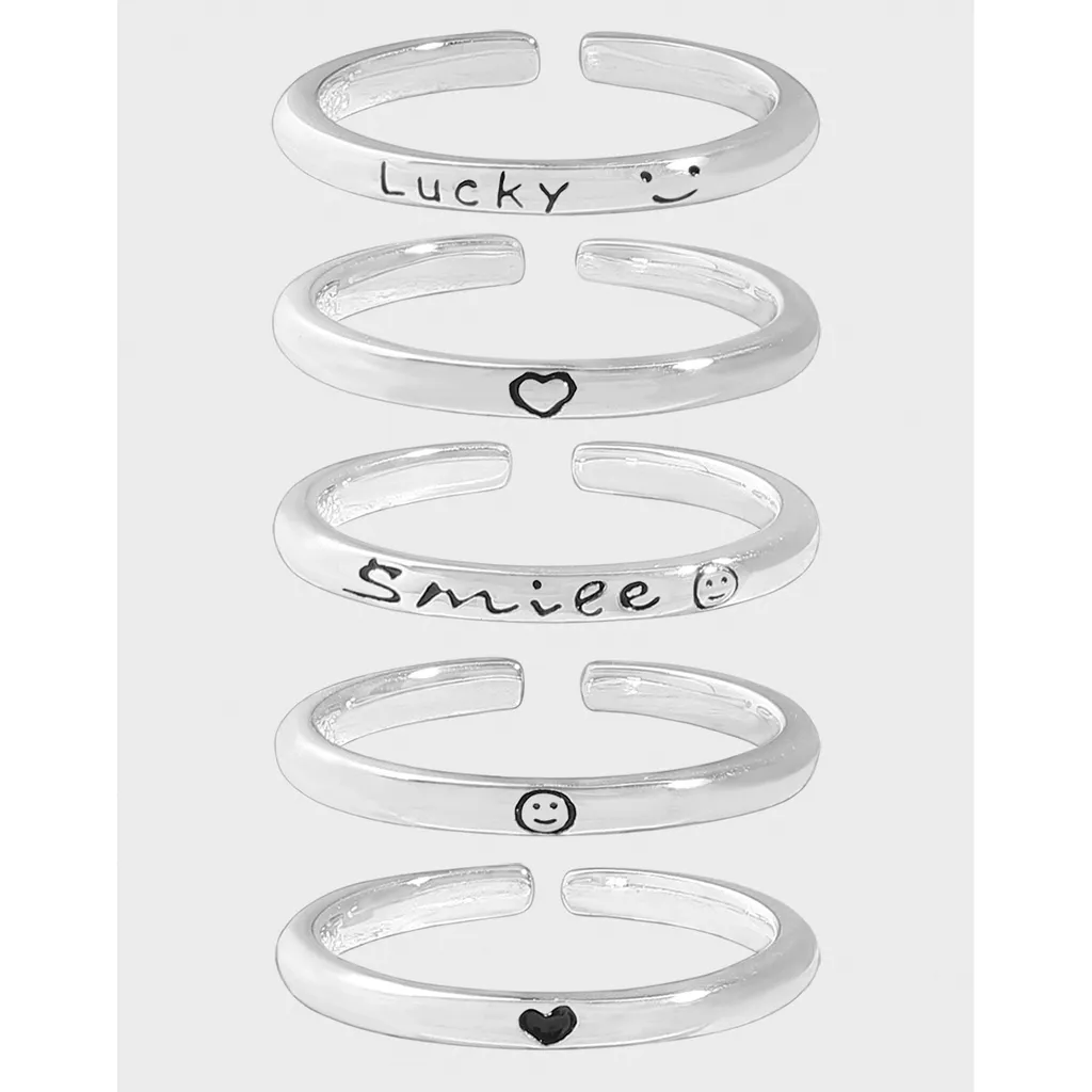Embrace your personal magic with Malisse’s collection of five sterling silver-toned adjustable rings, designed to add a delicate balance of joy and meaning to your everyday. Each piece, with its smooth and luminous finish, captures a unique facet of individual expression, reminiscent of the ethereal glow of the night sky.