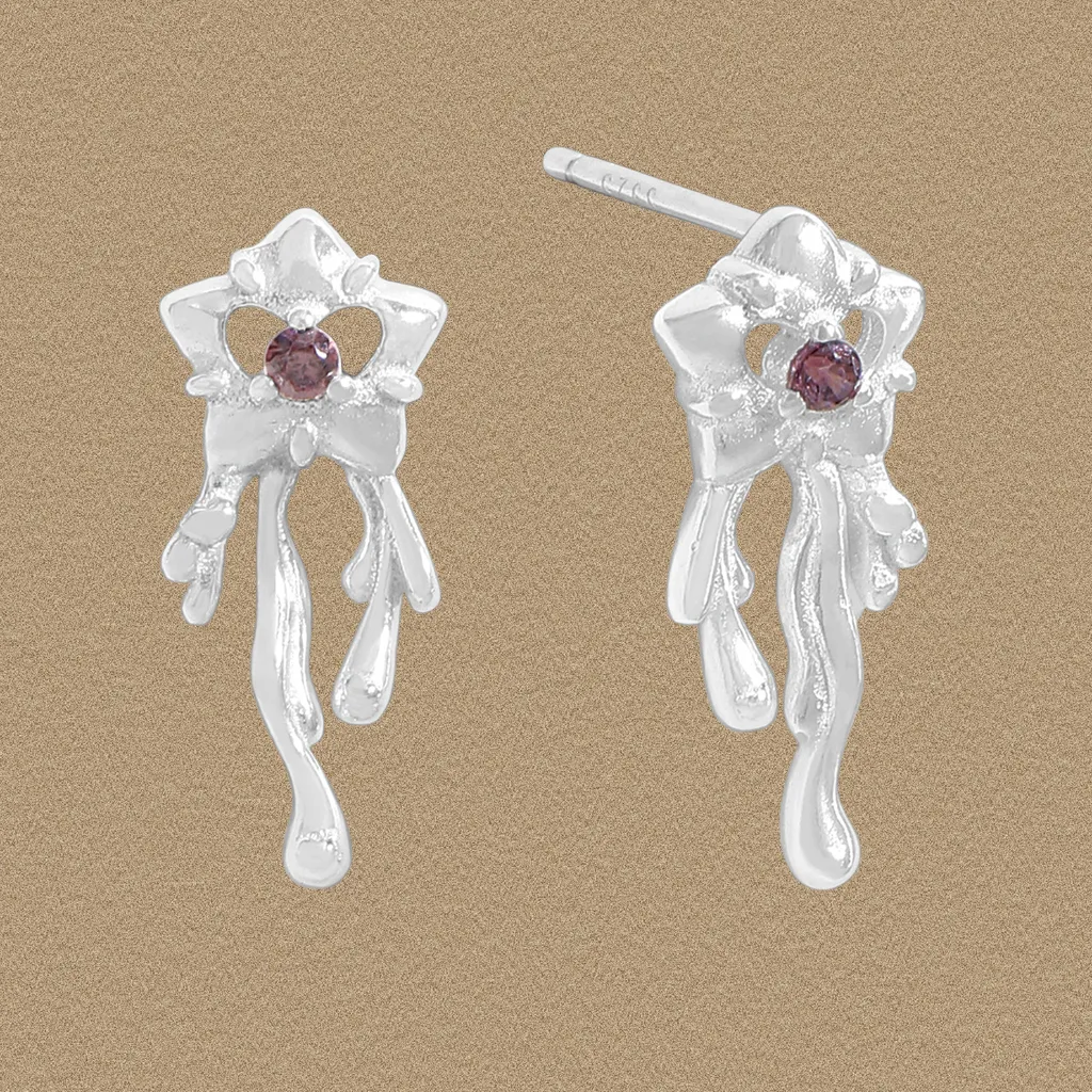 - Style: Each earring begins with a whimsical star-shaped element, accented with a delicate cut-out heart and bow details. From this celestial base, three fluid, molten-like tendrils cascade downwards, creating an elegant and dynamic dangle style that embodies organic movement and a touch of fantasy.