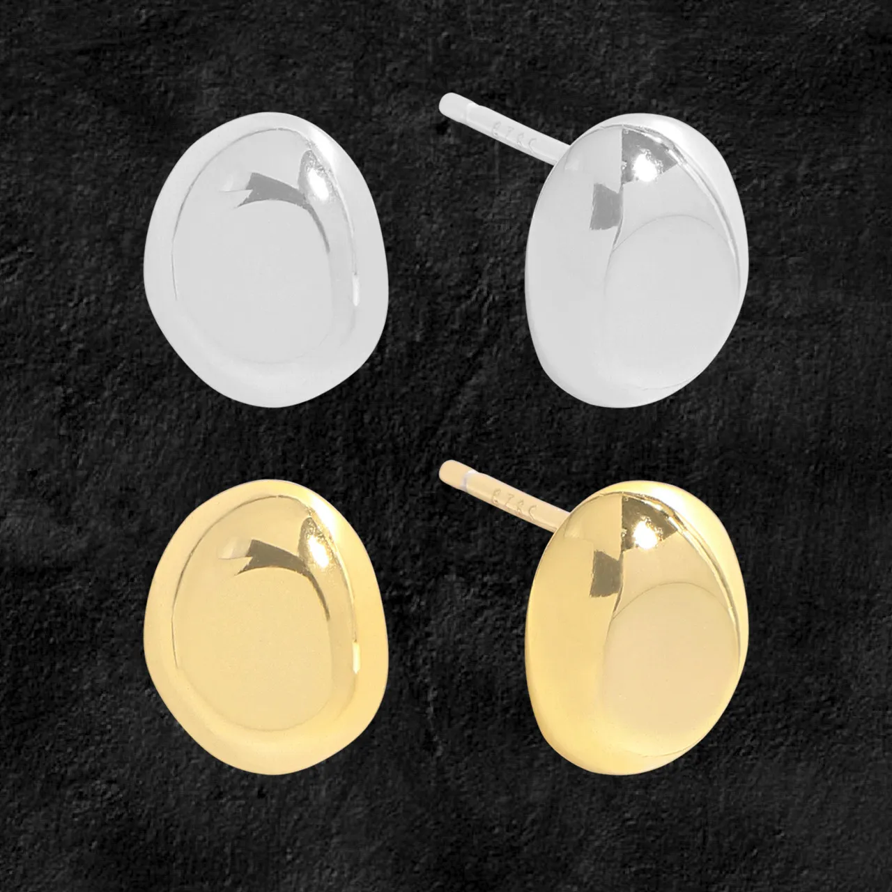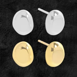 • Style: These contemporary stud earrings showcase a distinctive organic and fluid shape. Their subtly irregular, pebble-like silhouette is inspired by the smooth, natural contours found in nature, offering an understated yet striking presence.