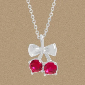 The vibrant ruby red gemstones, securely set within the silver structure, offer a striking contrast against the luminous metal. Each gem sparkles with a captivating depth of color, evoking the richness found in nature’s palette. The smooth, gleaming texture of the silver bow and chain provides a sophisticated foundation for the dazzling sparkle of the red stones.