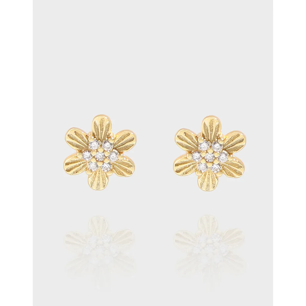 Inspired by nature’s delicate artistry, these exquisite stud earrings feature a charming floral design. Crafted in a radiant gold tone, each earring showcases six gracefully textured petals, radiating outwards from a dazzling center.