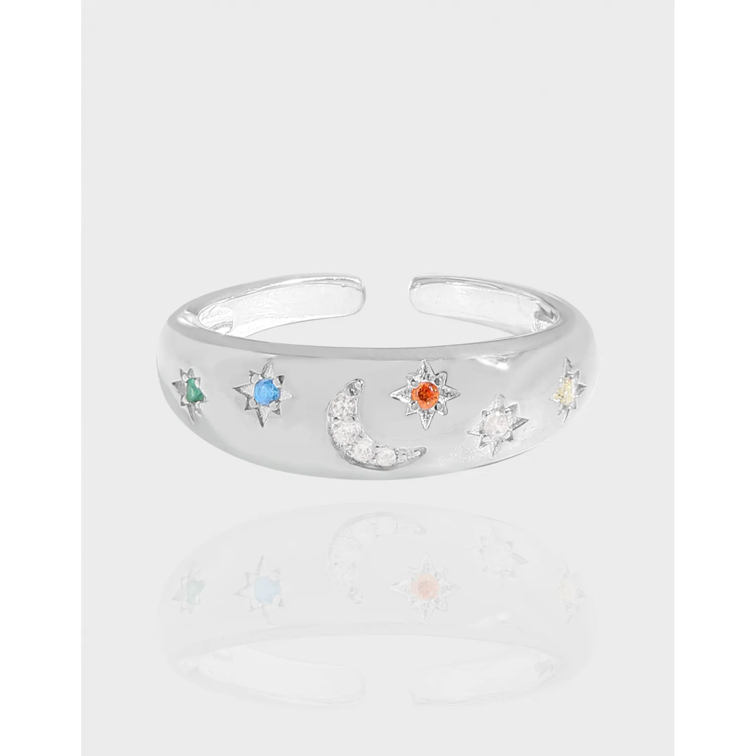 - Color: Crafted from polished silver, the Eloria Ring features an array of vibrant, multicolored gemstones that evoke the dazzling hues of a starlit night. Clear, brilliant stones pave the crescent moon, while individual green, blue, orange, and yellow gems illuminate the celestial star motifs.