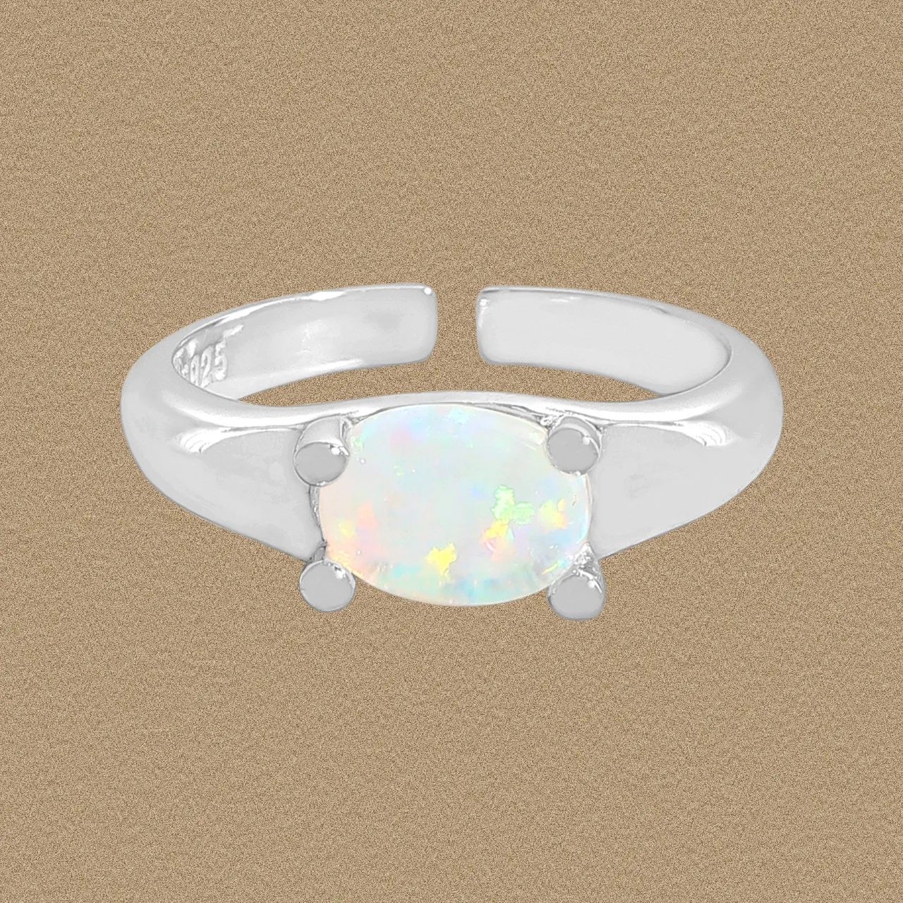 - Style: FeatuElsa Ring a minimalist yet elegant aesthetic, this ring boasts an adjustable band for versatile wear. The smooth, flowing lines of the silver band culminate in a delicate four-prong setting that securely cradles the opal, creating a timeless and sophisticated silhouette.