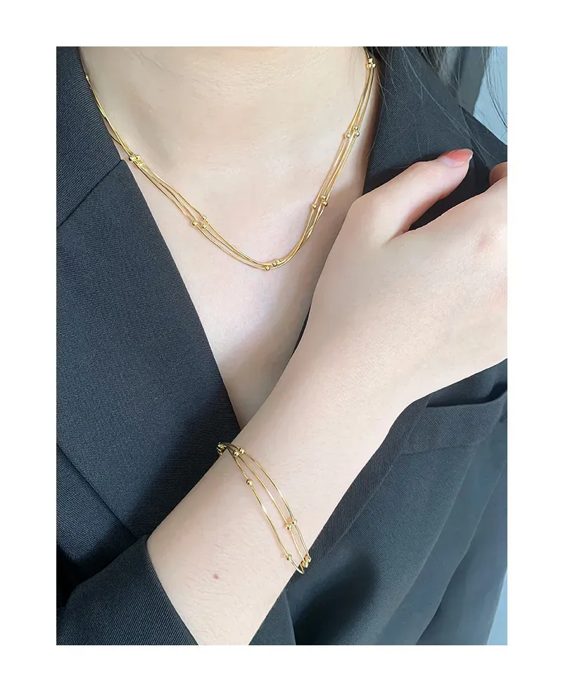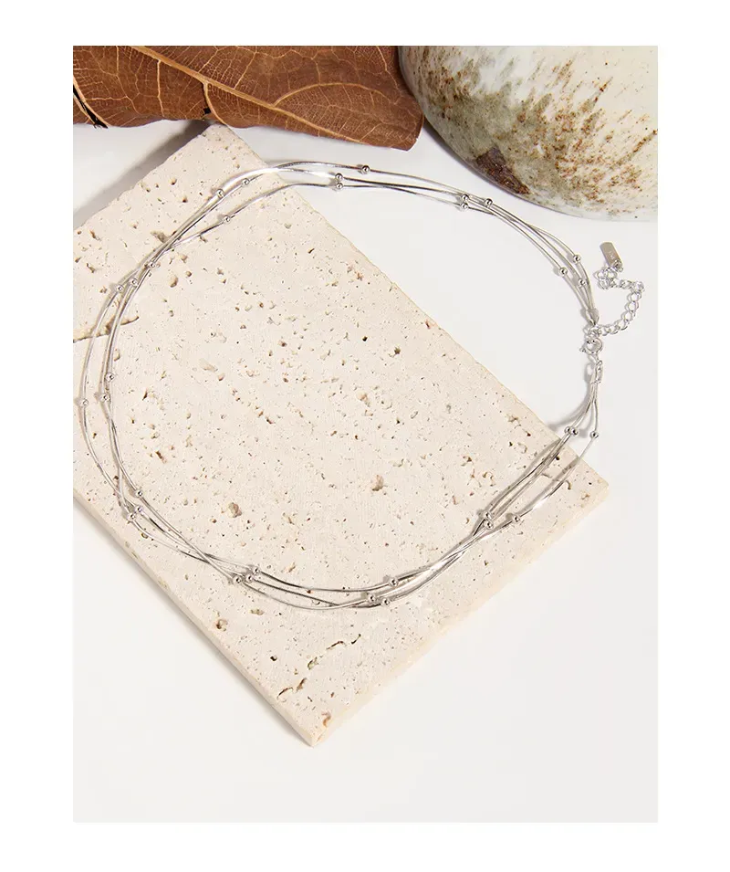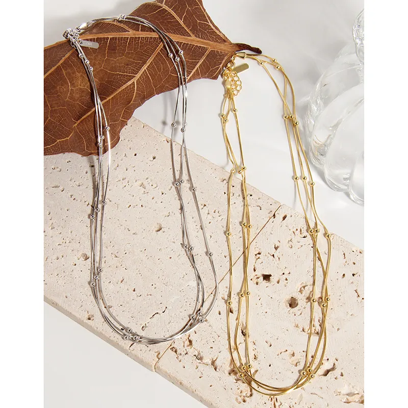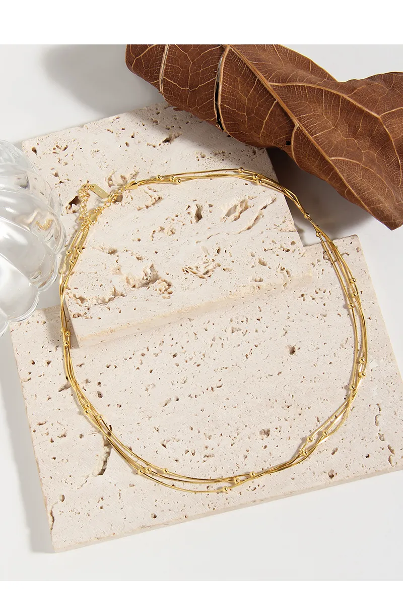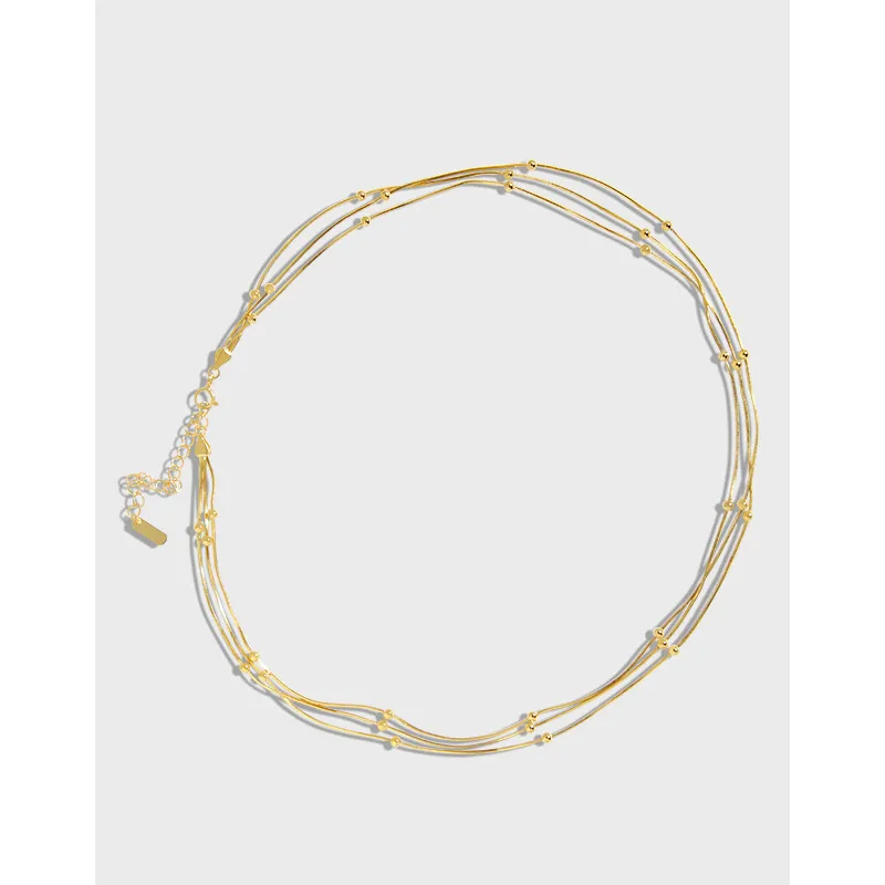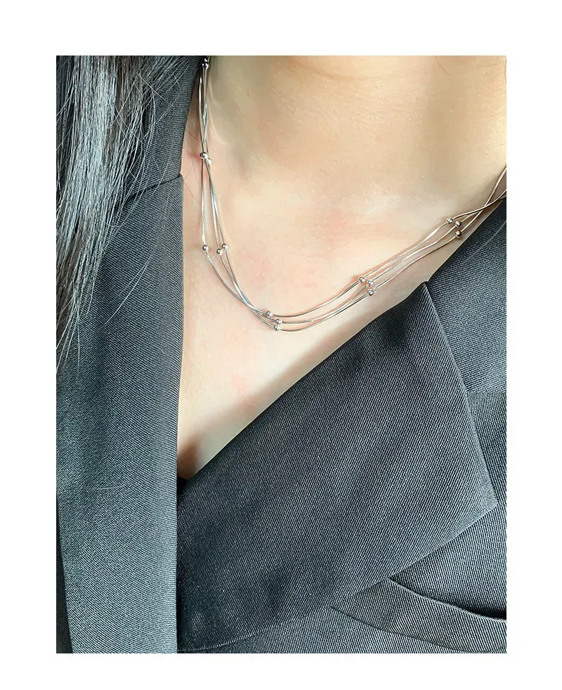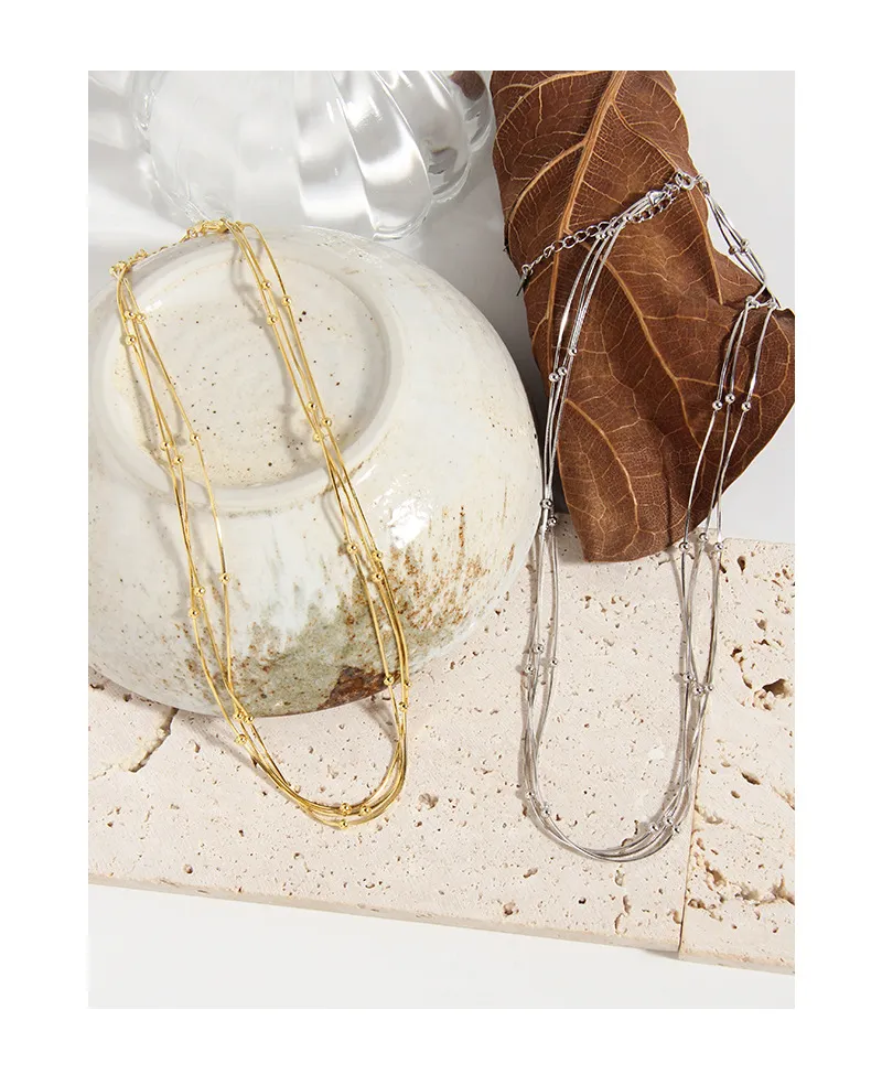 • Style: Featuring three slender, multi-layered strands, this Elythessa Necklace embodies a sophisticated and minimalist aesthetic. Its fluid shape drapes gracefully, offering a versatile piece that enhances any look with understated luxury. An adjustable extender chain ensures a perfect fit.