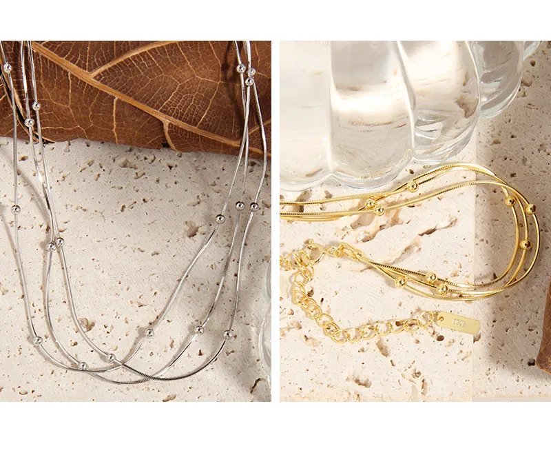 • Patterns & Textures: The design combines smooth, sleek chains with small, perfectly spherical beads spaced evenly along each strand. This creates a subtle yet rhythmic pattern, adding an intriguing tactile dimension and a delicate contrast between the linear and rounded forms.